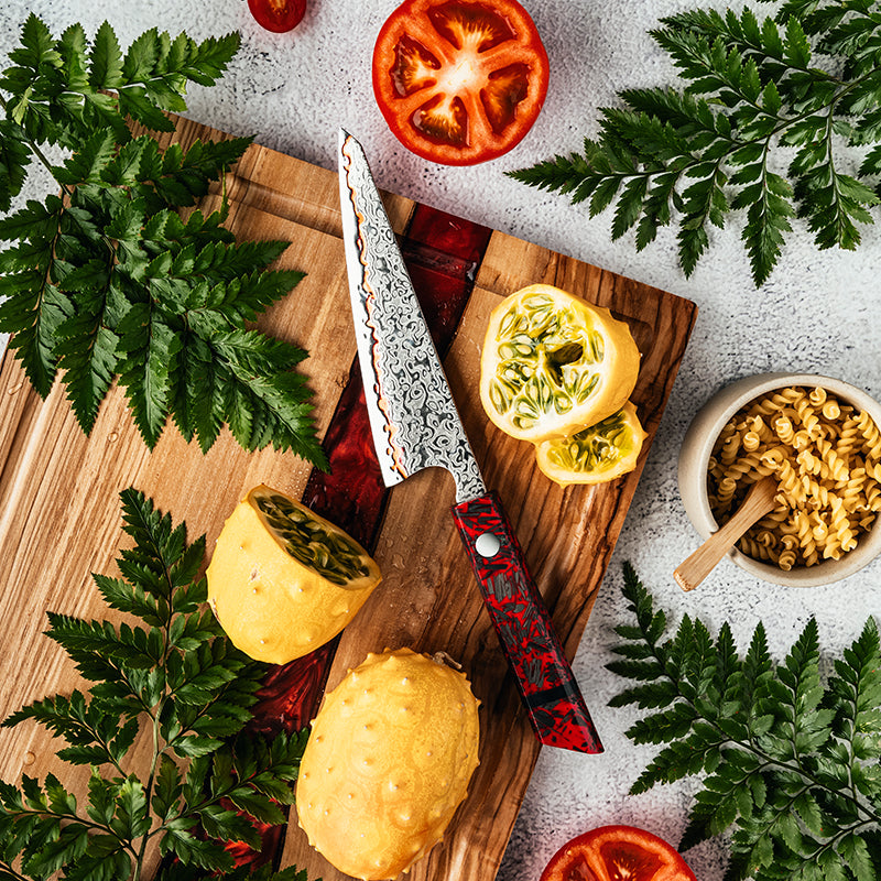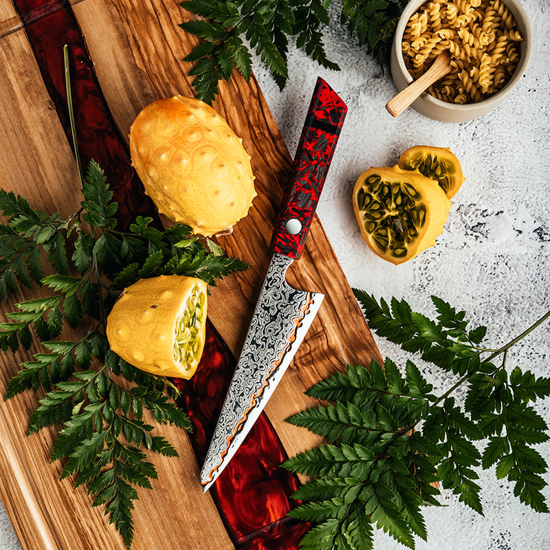 The blade is carefully made by combining Copper, VG10 and 15n20 steel through layering, welding, and hammering. This process gives each blade its own unique design, like a fingerprint. Each knife is a one-of-a-kind work of art.