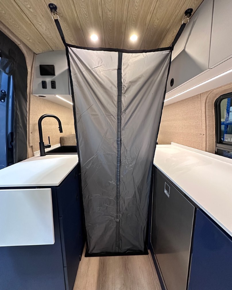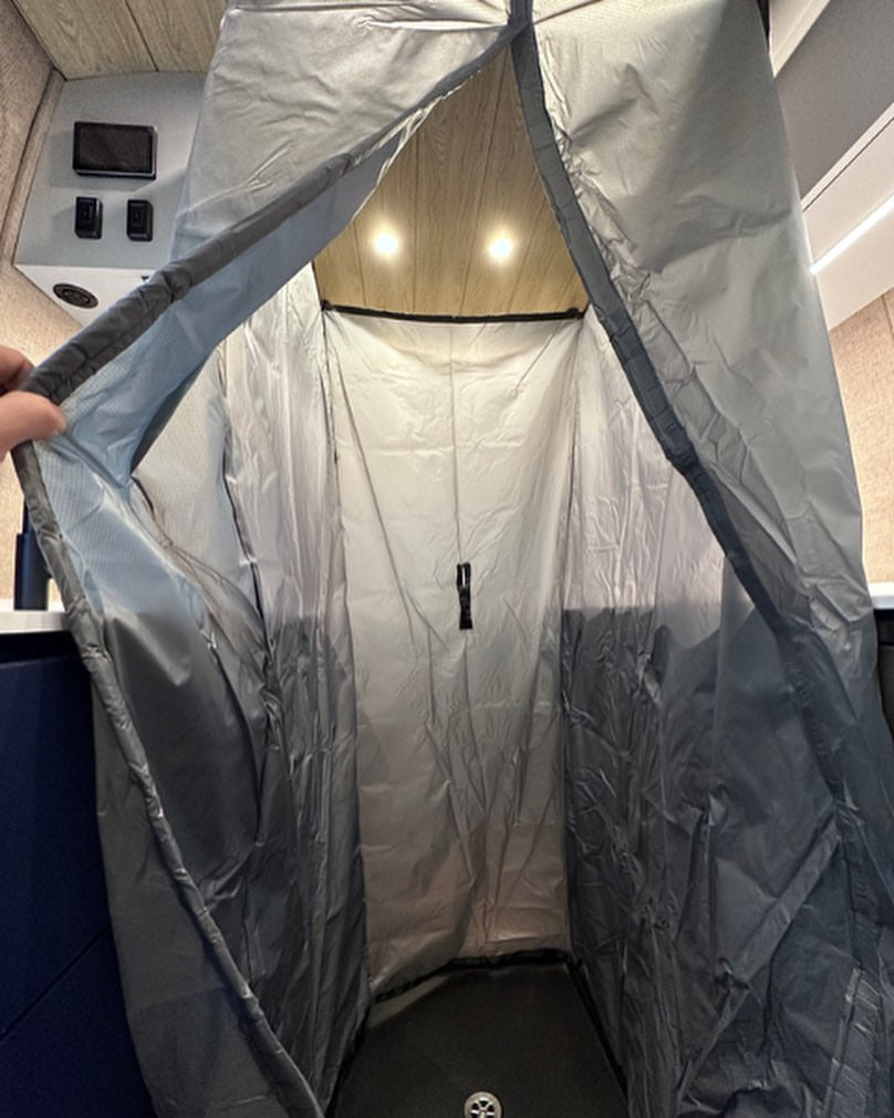 • (Optional) Tetravan Universal Shower Curtain - magnetic waterproof ripstop curtain, perfectly sized and designed to work with the Tetravan In-Floor Shower Pan (73" long)