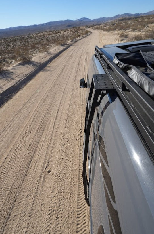 Not just another bulky side ladder that sticks out past your mirrors. RB's side ladder is designed to hug the contour of your Sprinter van. Our ladder can be mounted directly to the OEM roof rails or to an existing RB roof rack. The lower part of the ladder is designed to give maximum clearance where ever you adventure takes you. Made from lightweight square aluminum tubing and finished off with a heavy duty powder coat finish. Made in the U.S.A