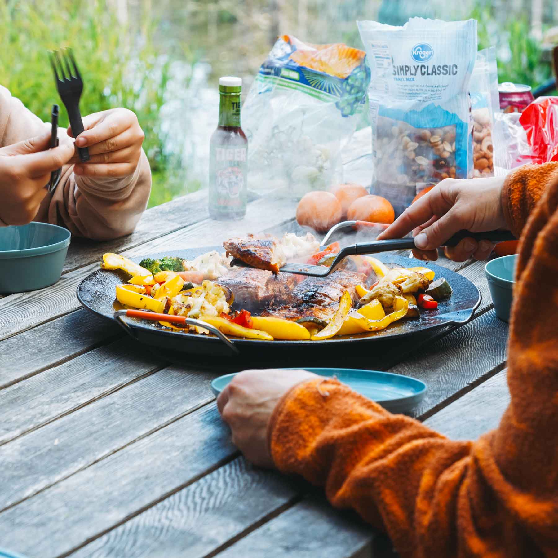 • More versatile than a flat-top skillet and more portable than a cast-iron pan, the subtle concave Cast-Iron Skillet lets you cook anything you desire, anywhere you roam.