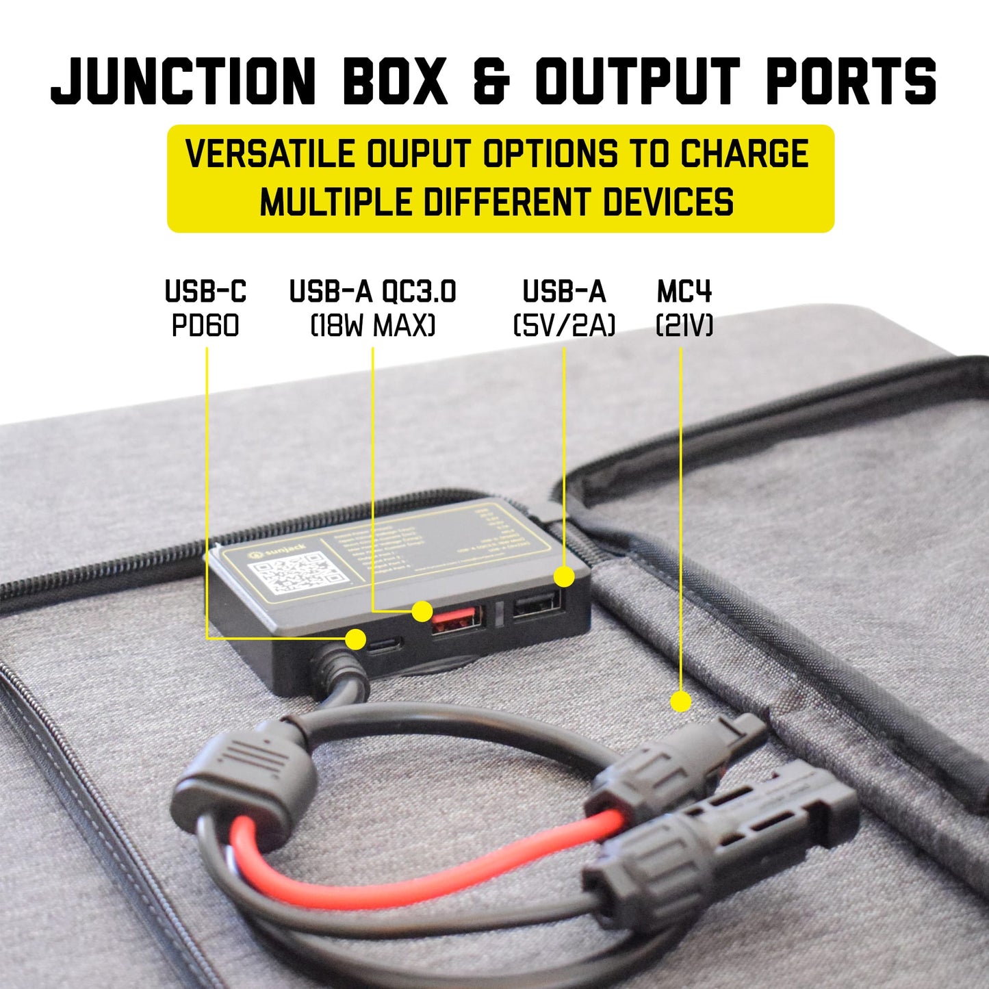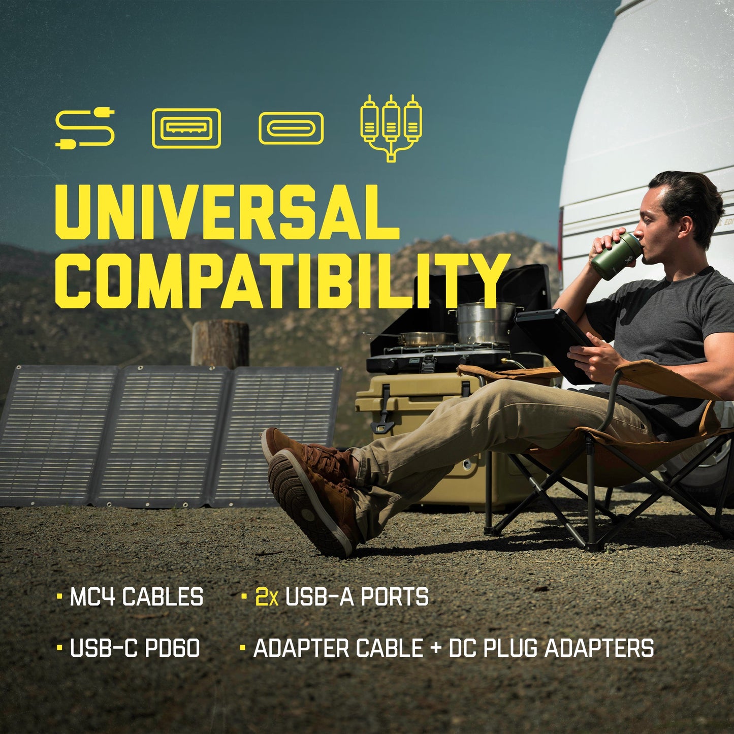 WIDE COMPATIBILITY & VERSATILE: Designed to work with multiple different devices. The MC4 output cables and the included adapter cable with XT60, DC5521 and Anderson plugs, plus the DC adapter plugs, ensure maximum flexibility and endless connection options. Compatible with most power station and solar generator battery. Additionally, the PD60 USB-C and QC3.0 USB-A output ports let you charge a wide range of USB devices, such as phone, tablet, power bank, laptop and more.