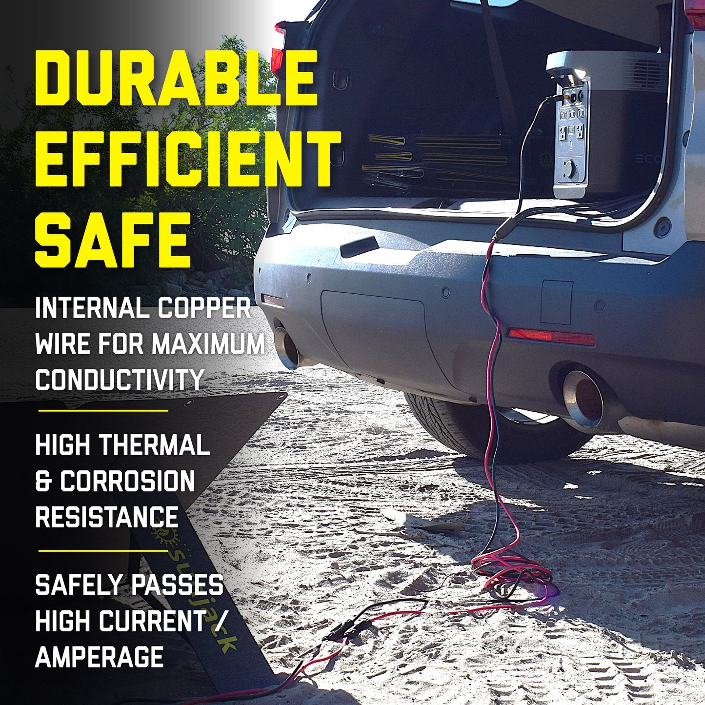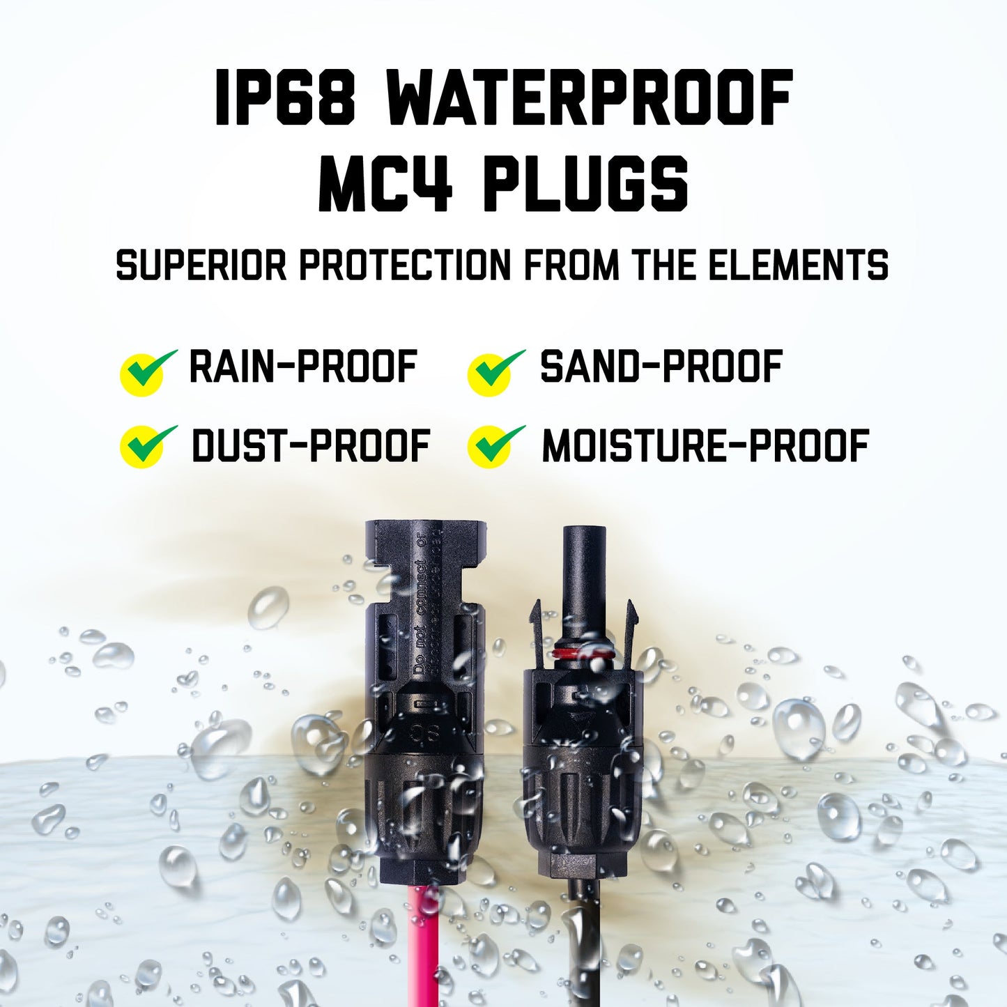 • EFFICIENT & SAFE: Internal heavy-duty copper wire provides minimal power loss with improved efficiency and emits low heat during power transfer between the solar panel and the power station. Safely pass up to 28A of current. The durable outer PVC insulation is thick, scratch and corrosion resistant, and resistant to high and low temperatures, corrosion, and UV damage. MC-4 plugs are waterproof, rated IP68.