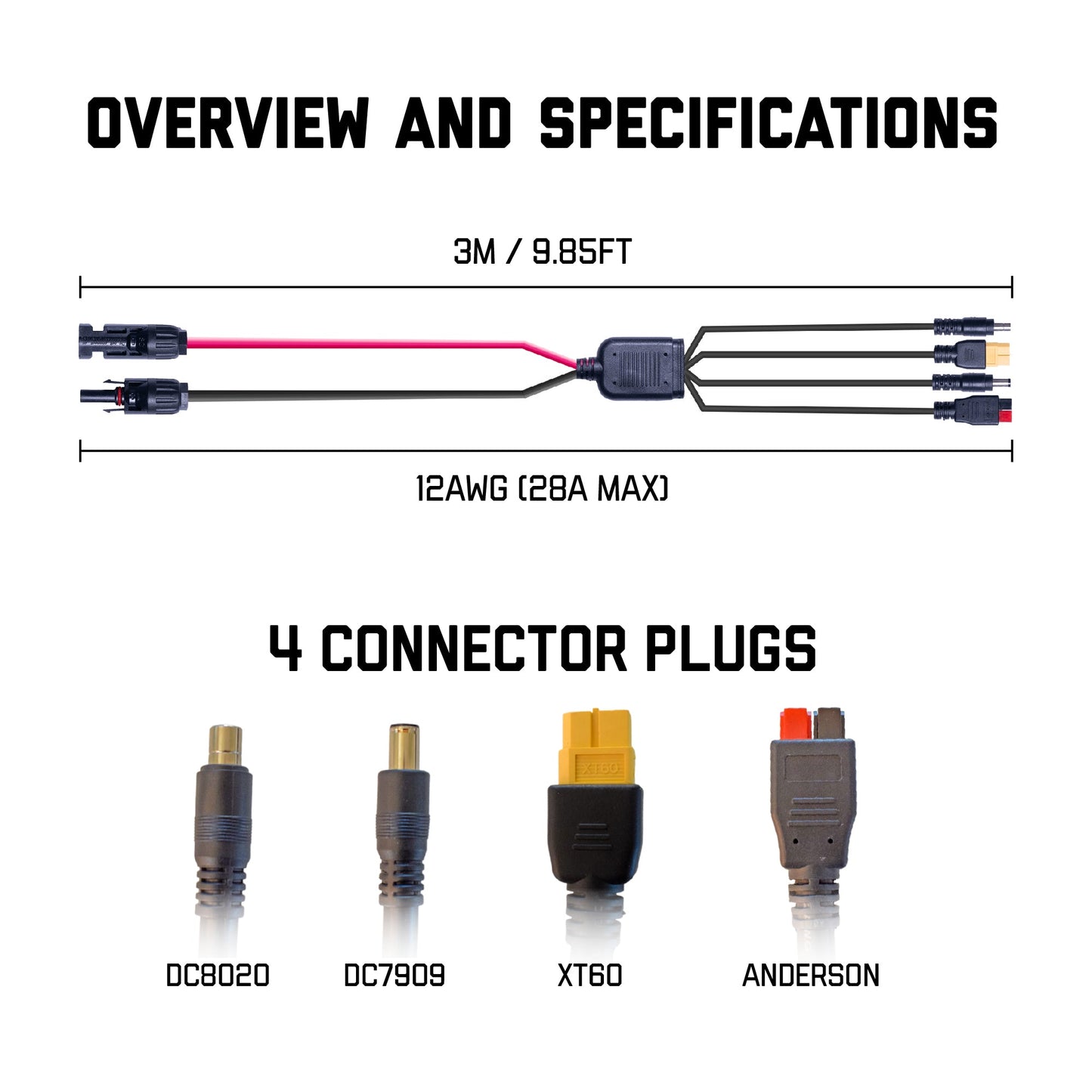 • MC4 SOLAR ADAPTER CABLE: This adapter cable is comprised of one main cable that splits into four branch cables. The main cable has MC-4 plugs and is designed to connect to the power source (solar panel). There are four separate branch cables and plugs: (1) XT60, (2) Anderson (3) DC 7909 and (4) DC 8020 (8mm). The branch cables are designed to connect to a power storage device, such as a power station.