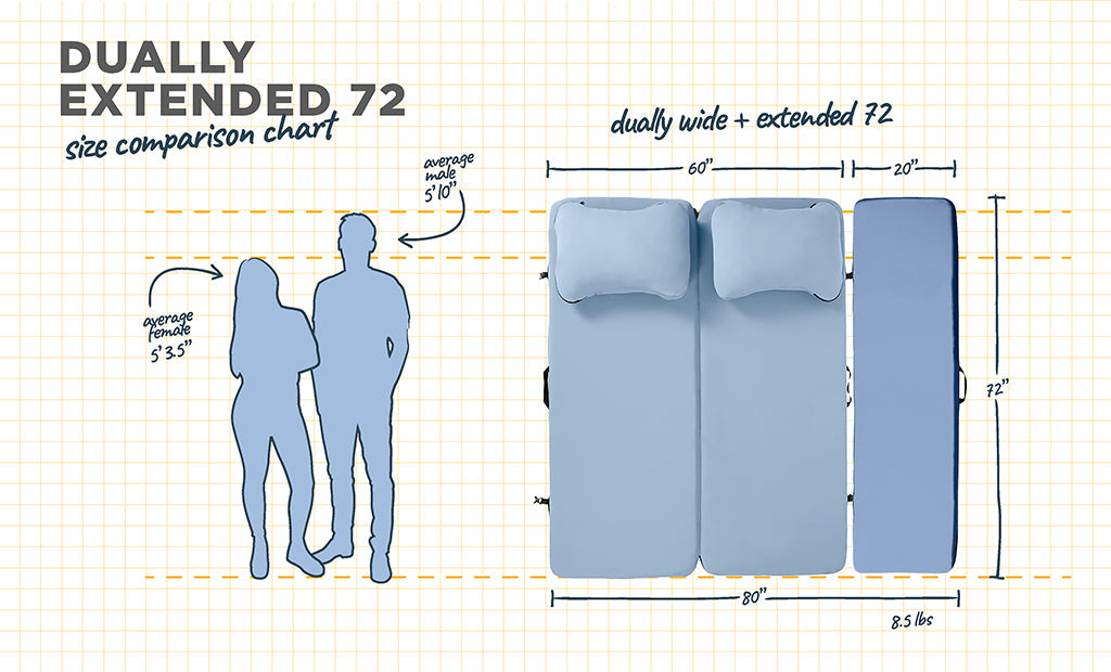 The Dually Extend expands the sleeping area of the Dually by maximizing extra space with HEST’s enhanced memory foam. The Extend easily attaches to HEST Dually models—Dually Extend 72 for the Dually Wide and Dually Extend 78 for the Dually Long or Queen—offering a larger mattress area suitable for slide-outs in campers, larger RTTs, and RVs. It can also be used alone on benches or other narrower spaces.