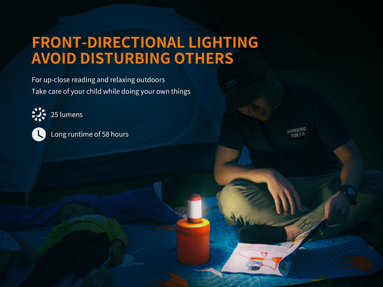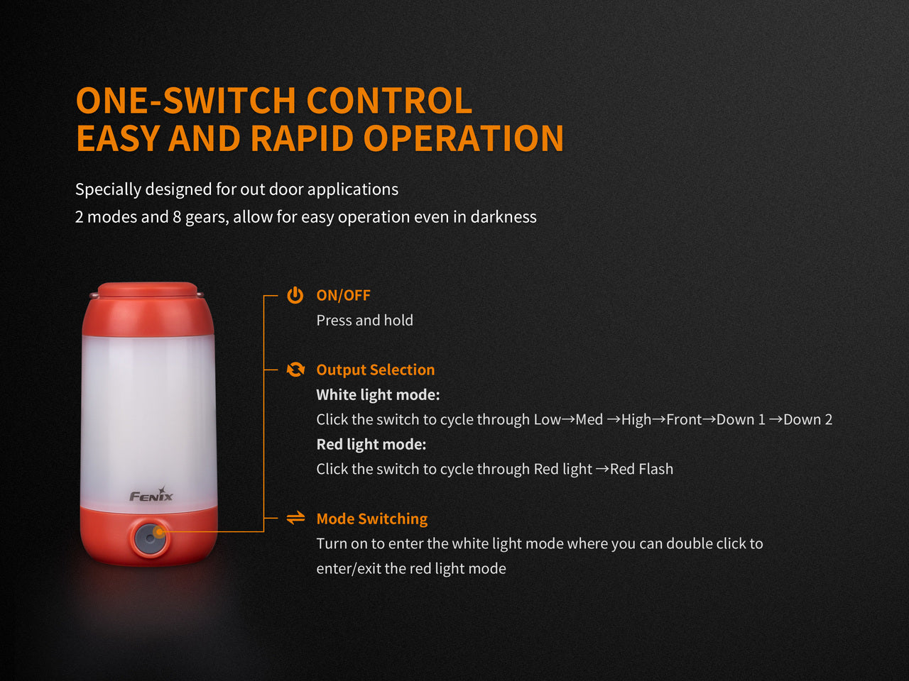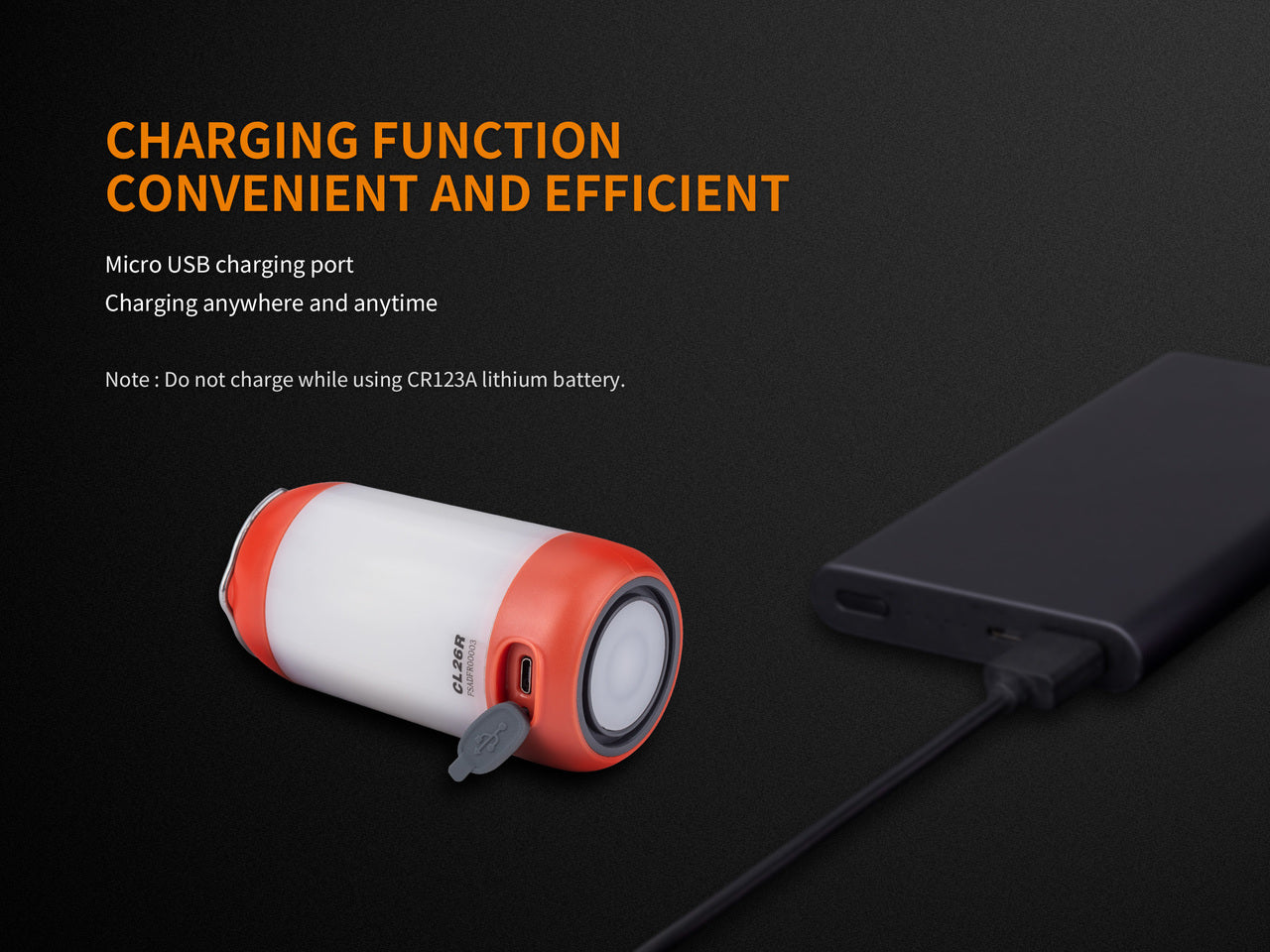 The CL26R camping lantern is here to light up your outdoor life. This small but mighty lantern packs 400 lumens of power with a 240-hour runtime on low. At max output, it runs for up to 5 hours with a beam distance of 82 feet. It's powered by a 2600 mAh 18650 rechargeable battery (included) or is compatible with two CR123 batteries (not included). The top of the lamp is magnetic, allowing you to hang it from any metal surface with ease. Its one-switch control makes it a cinch to turn on and access the 6 white and 2 red output levels. Choose from Red, Green, or Black - the CL26R is a must-have for any outdoors enthusiast!