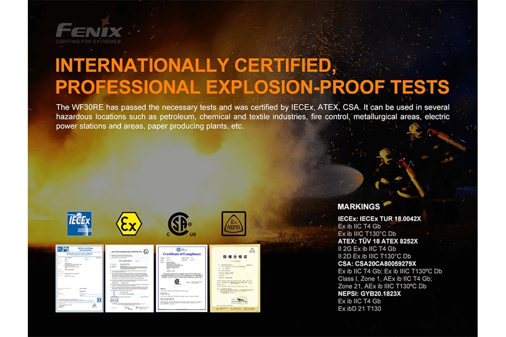 The WF30RE is certified for use in hazardous environments by IECEx, ATEX, and CSA, designed to work safely in Zone 1 and Zone 2 gas-filled areas and Zone 21 and Zone 22 combustible dust environments. It is specially designed to allow for direct in-light recharging (do not charge while in dangerous environments) and the battery allows it to operate up to 120 hours and reach a maximum of 280 lumens. The temperature-resistant design and IP68 water and dust proof rating make this a perfect light for use in hazardous environments.