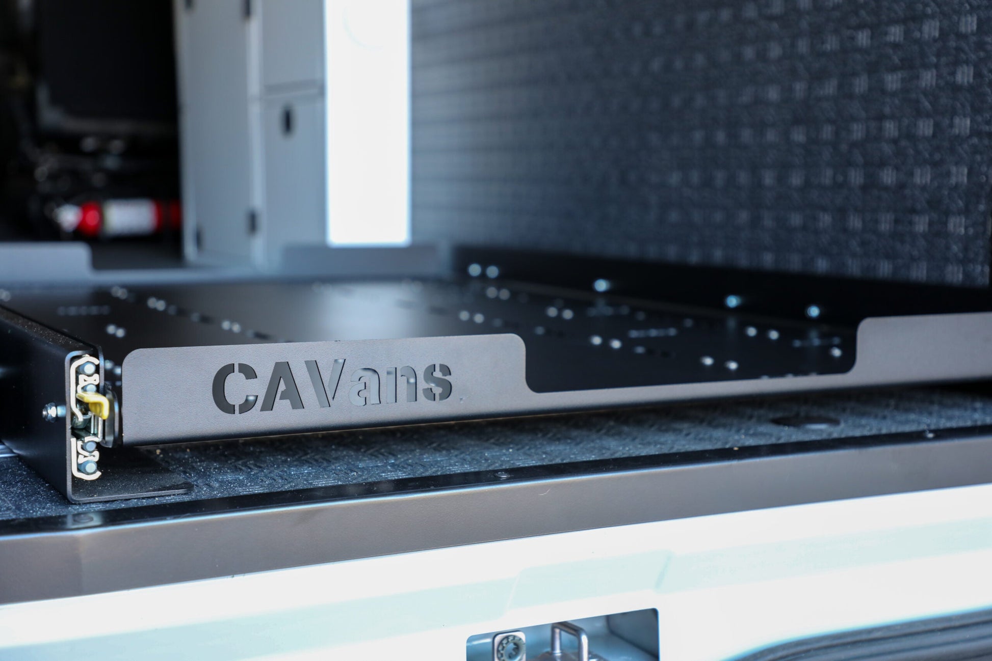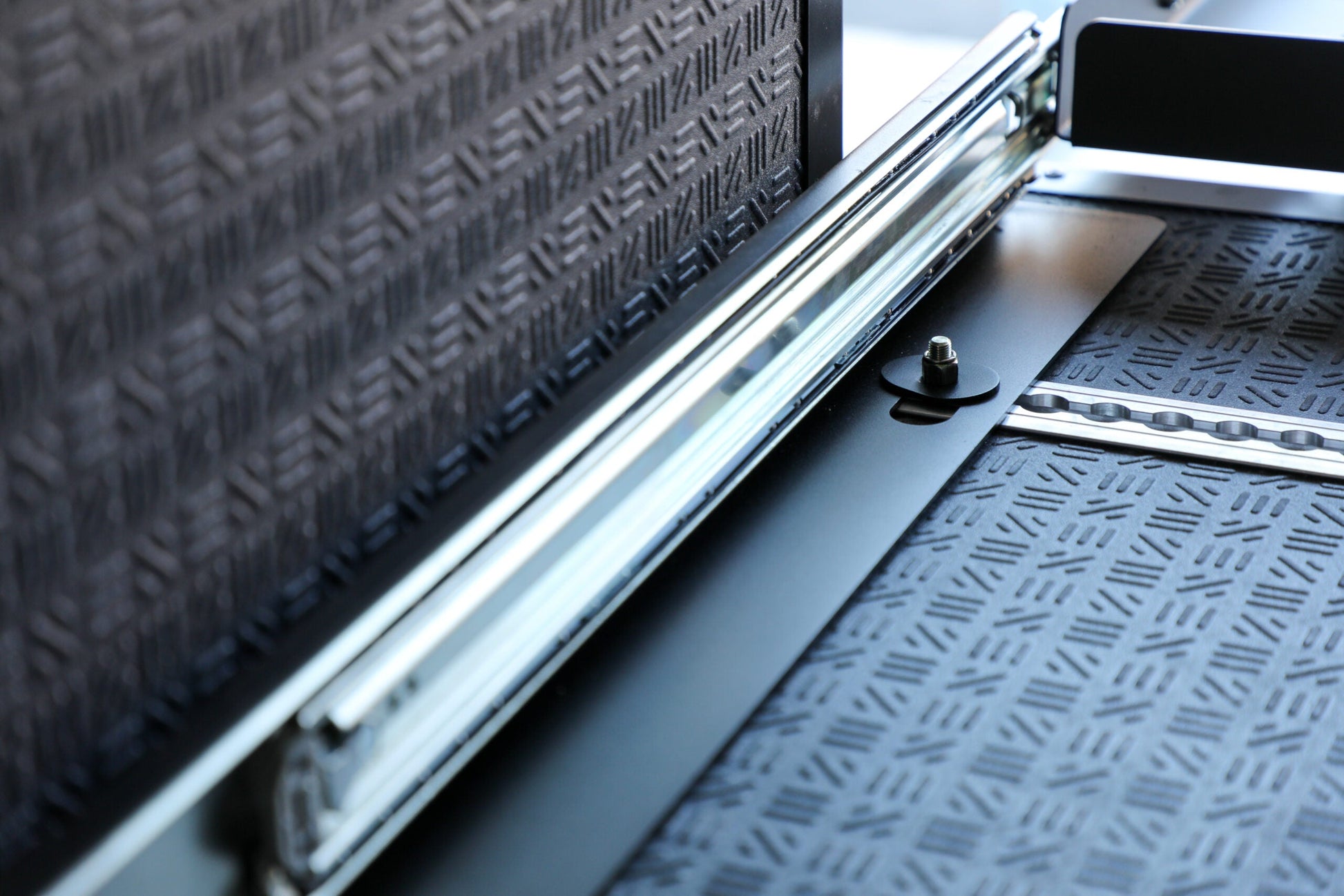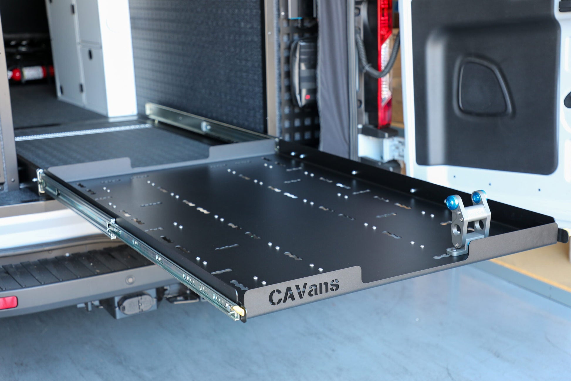 This durable black slide-out deck, designed exclusively for Grit Overland Vans by CANYON ADVENTURE VANS, solves the problem of limited space in your vehicle while on your next adventure. With its unmatched sturdiness and stylish design, you can now easily access and organize your gear without sacrificing valuable space. Experience unmatched sturdiness and style for your next adventure.