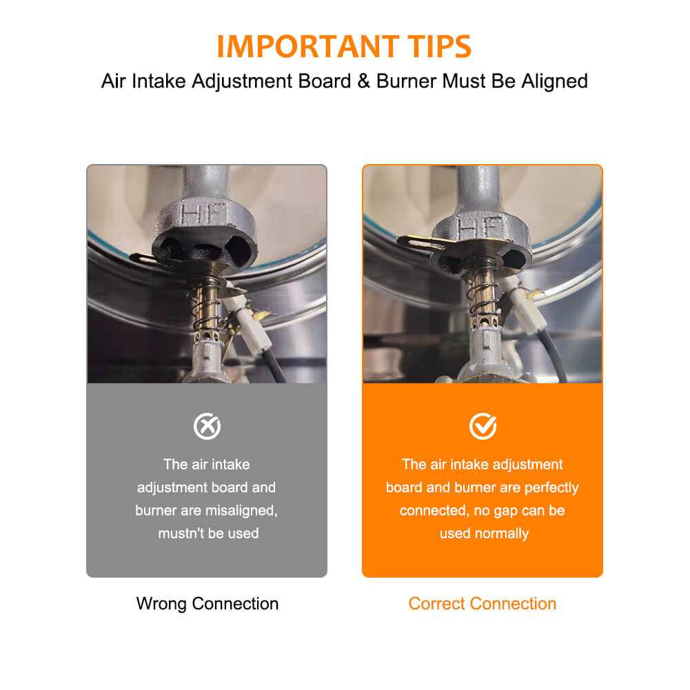 • Important Tips - After receiving the gas stove, please check the bottom of the gas stove, the air intake adjustment board and burner must be aligned. If it is not aligned, please contact our customer service