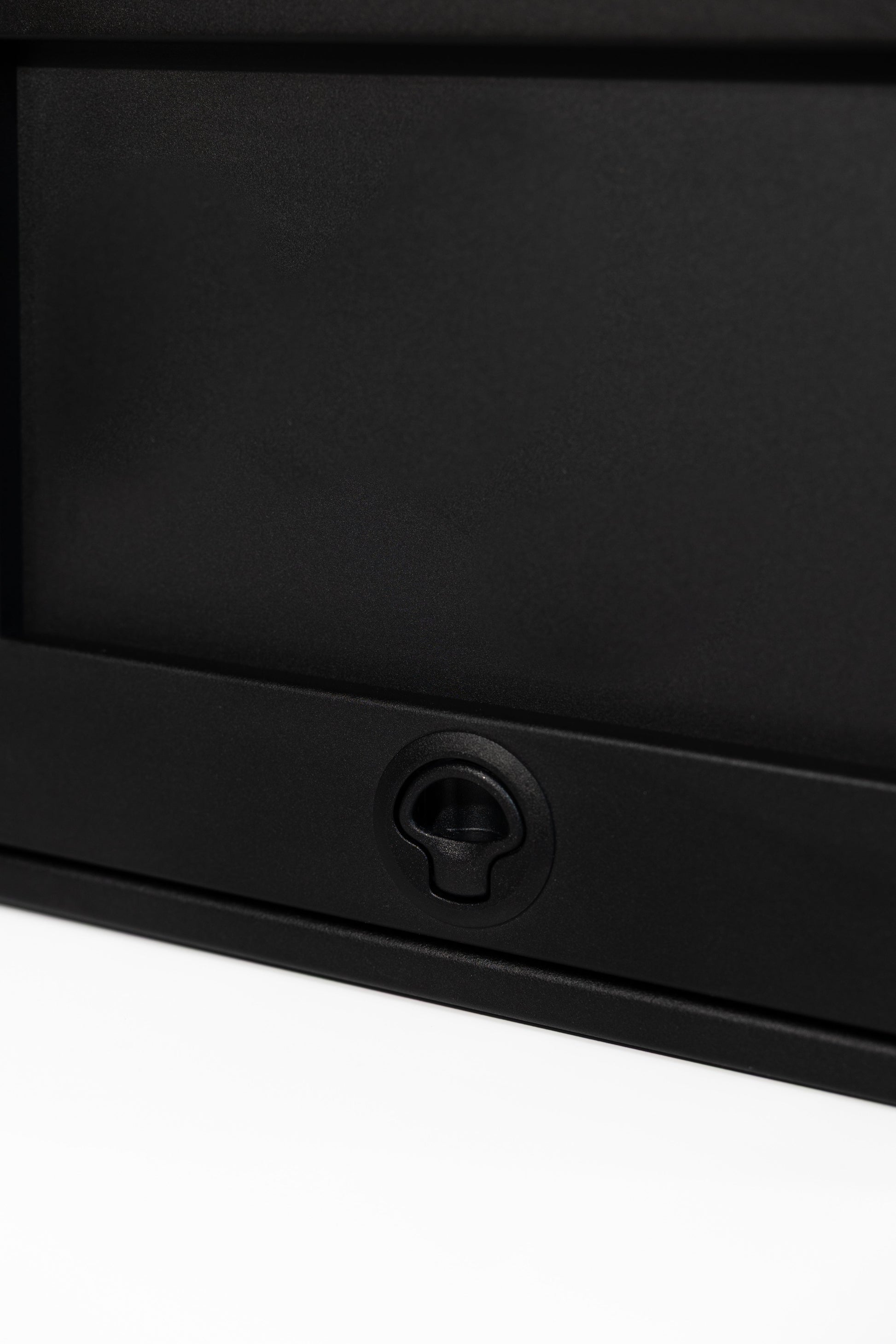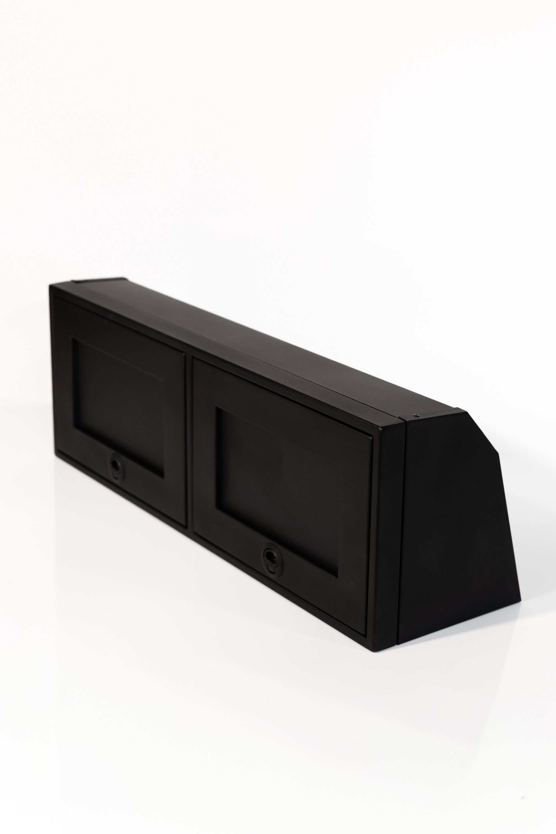 Powder coated aluminum cabinet with fully enclosed top, bottom, and rear. Angles will allow cabinet to fit in a Sprinter, Transit, and Promaster.