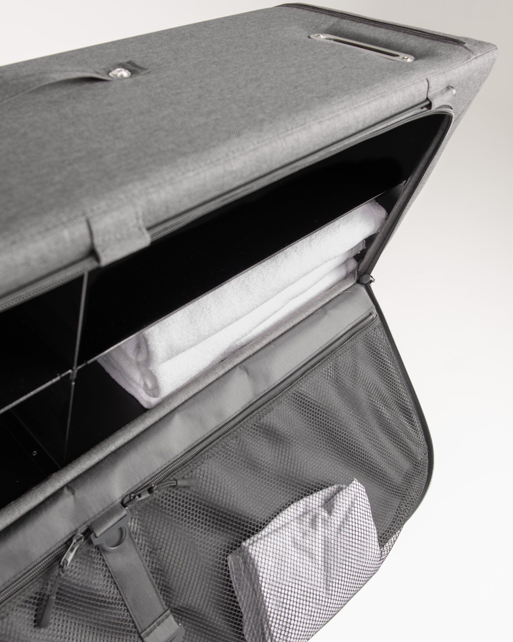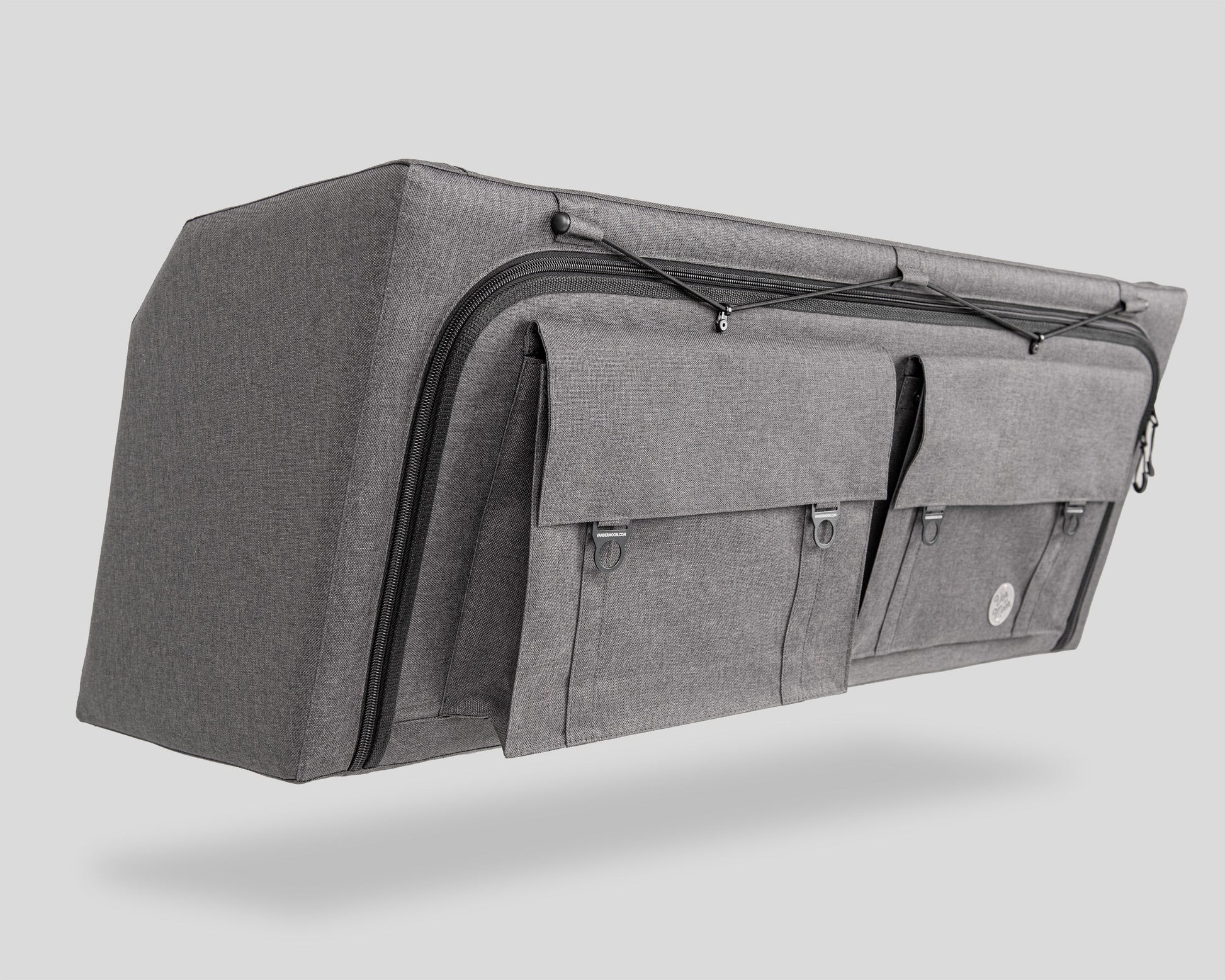 Moon Box is finished with a durable Corian fabric. The inside of the fabric is laminated with a special coating that makes the Moon Box is waterproof and vapor-proof. The dense and tight weave makes the fabric light and very durable at the same time. The metal frame with soft exterior prevents rattles and squeaks from your cabinet and makes it safer if you bump your head. Finally, the zipper closure ensures your cabinet won't open while you're driving.