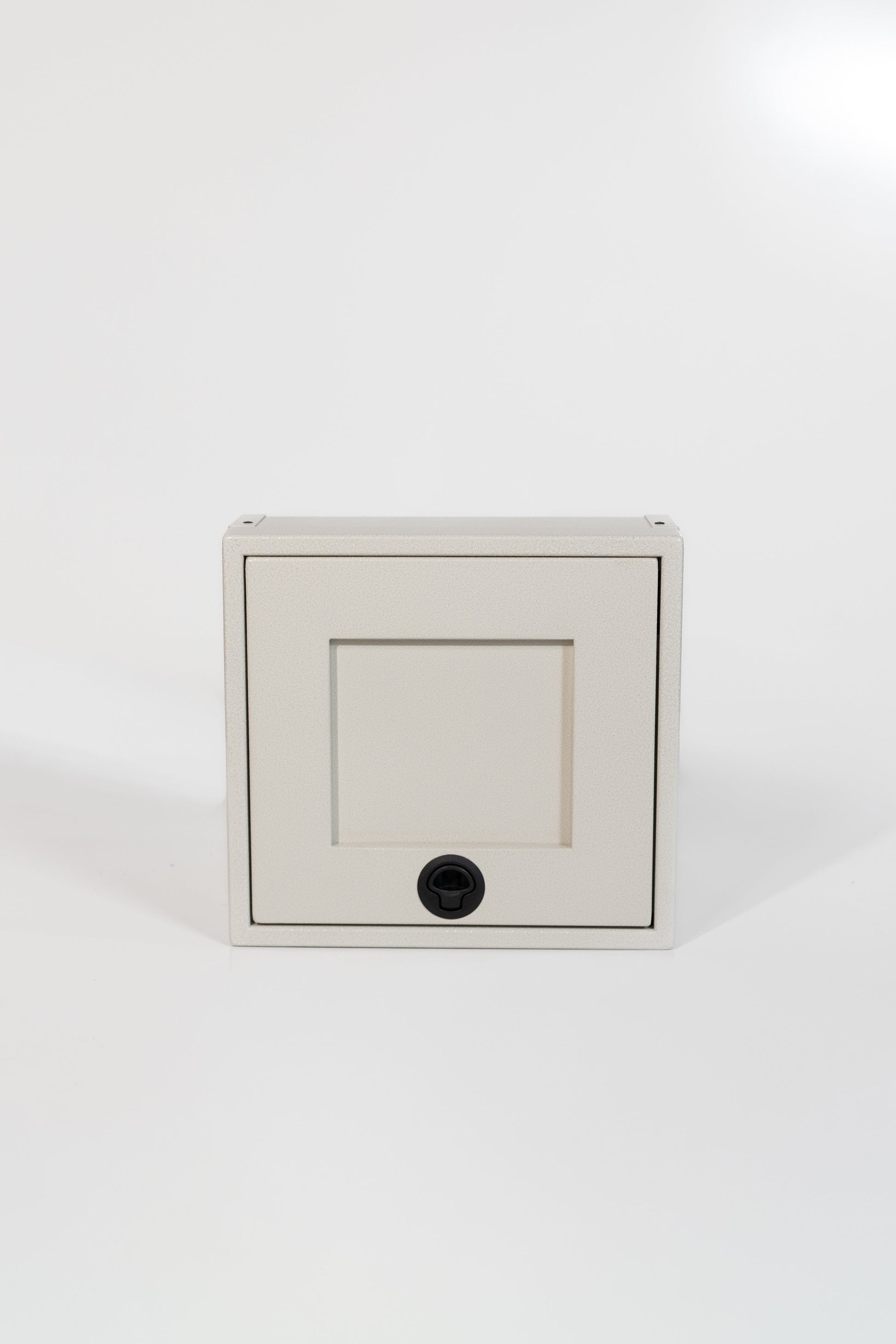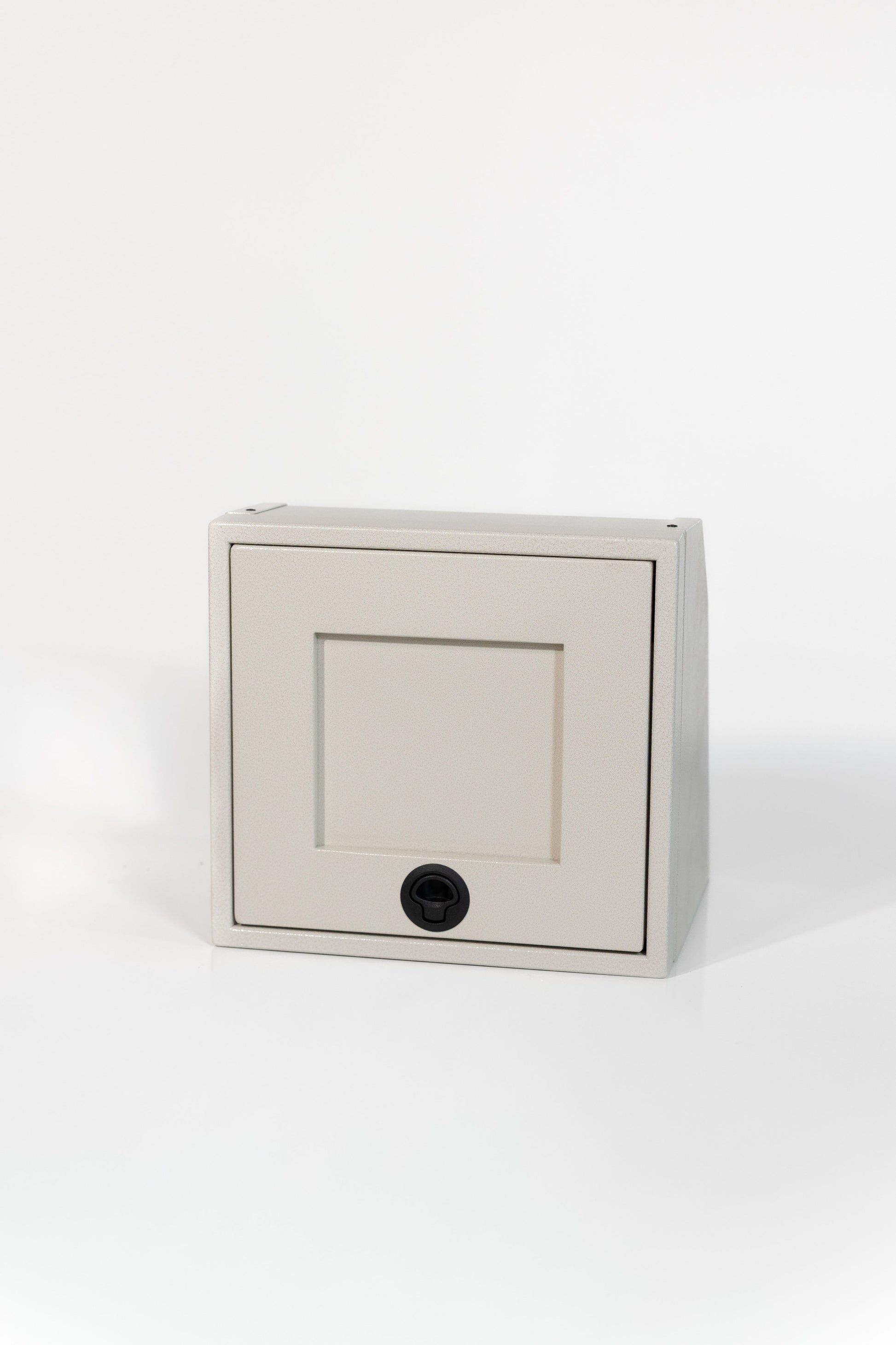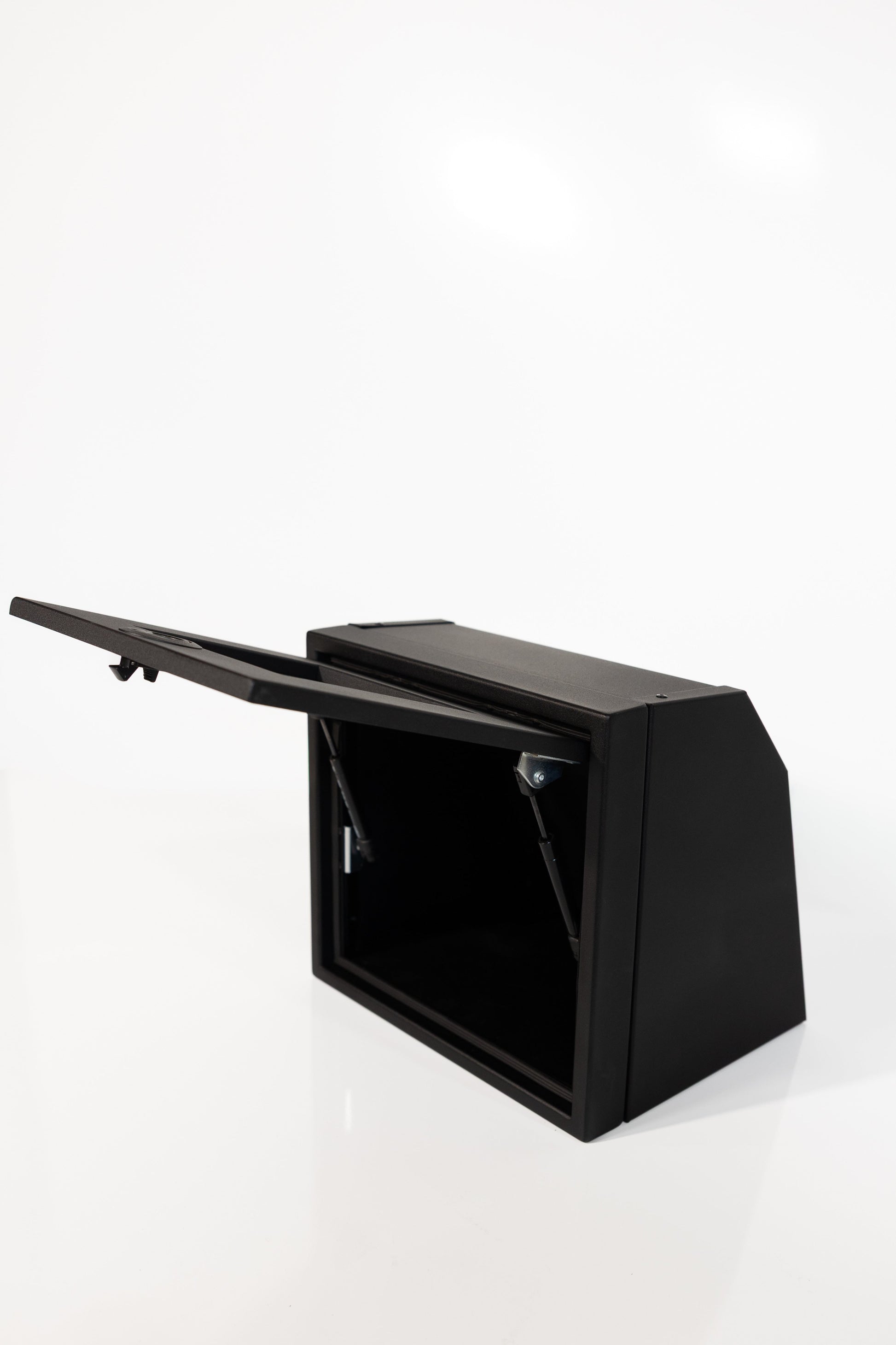 Powder coated aluminum cabinet with fully enclosed top, bottom, and rear. Angles will allow cabinet to fit in a Sprinter, Transit, and Promaster.