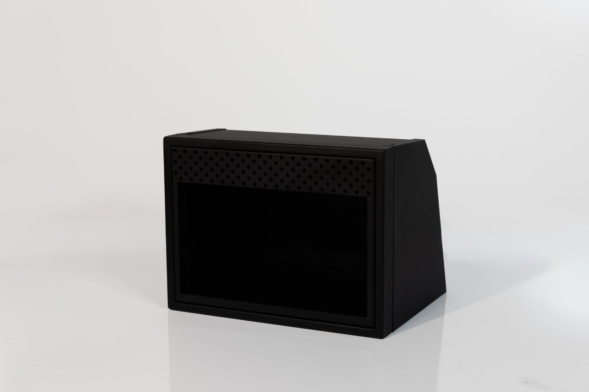 Powder coated aluminum cabinet with fully enclosed top, bottom, and rear. Angles will allow cabinet to fit in a Sprinter, Transit, and Promaster.