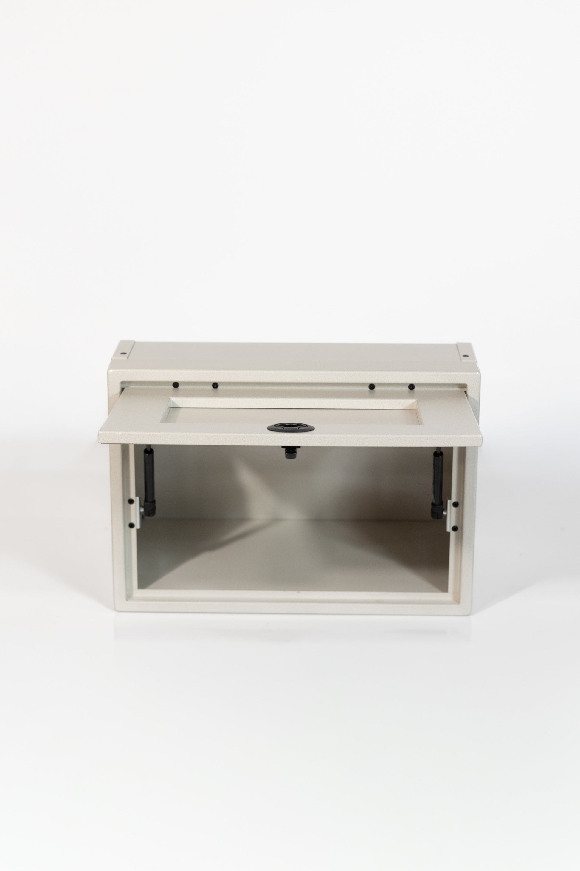 Powder coated aluminum cabinet with fully enclosed top, bottom, and rear. Angles will allow cabinet to fit in a Sprinter, Transit, and Promaster.