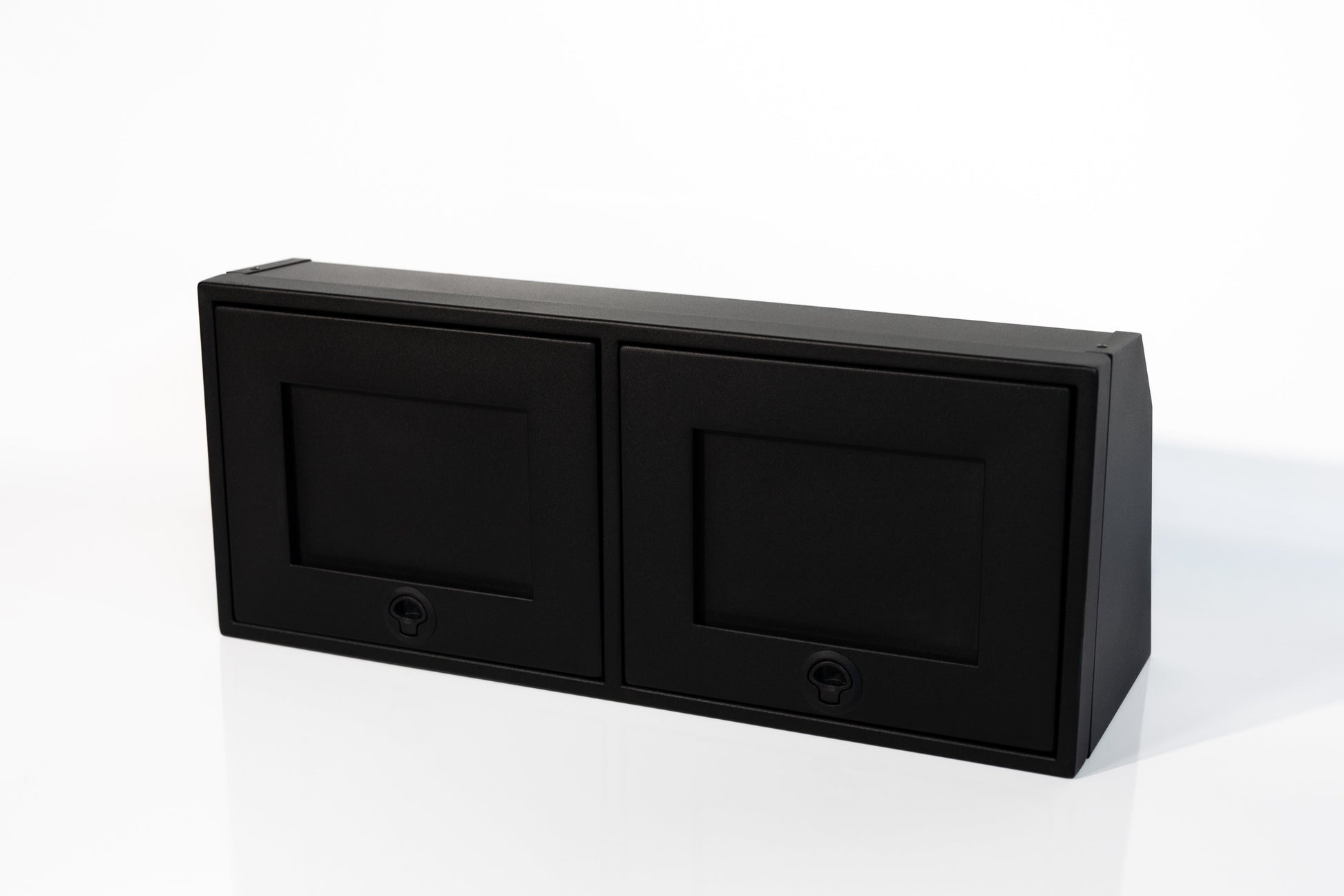 Powder coated aluminum cabinet with fully enclosed top, bottom, and rear. Angles will allow cabinet to fit in a Sprinter, Transit, and Promaster.