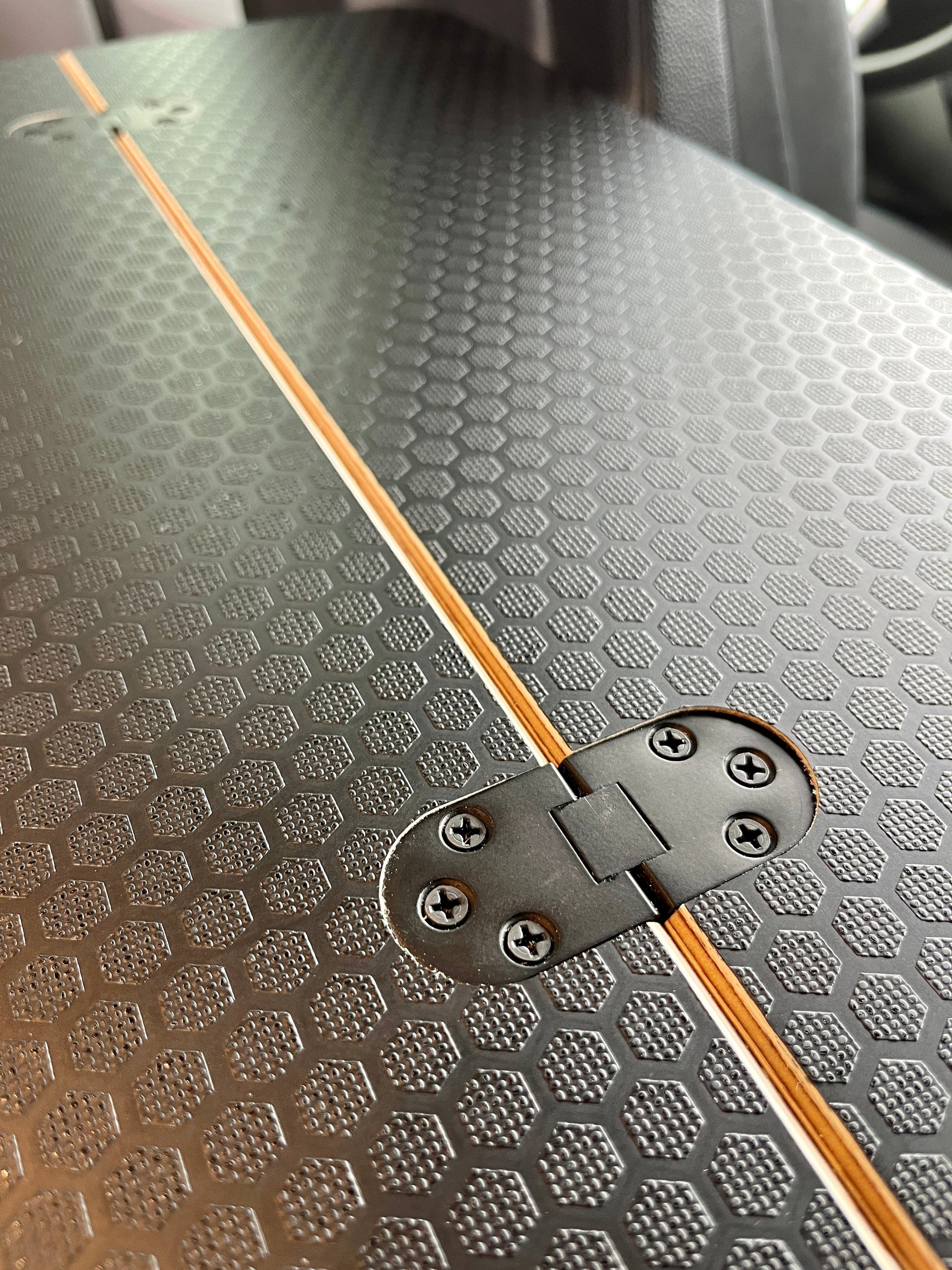 The Original folding black hex laminated table made for Lagun mounts. Add more workspace and flexibility to your camper with this folding bamboo table. When folded closed it is 21 1/2"x14", when fully extended it measures 21 1/2 x 28". Hinges are on top and exposed in the open position.