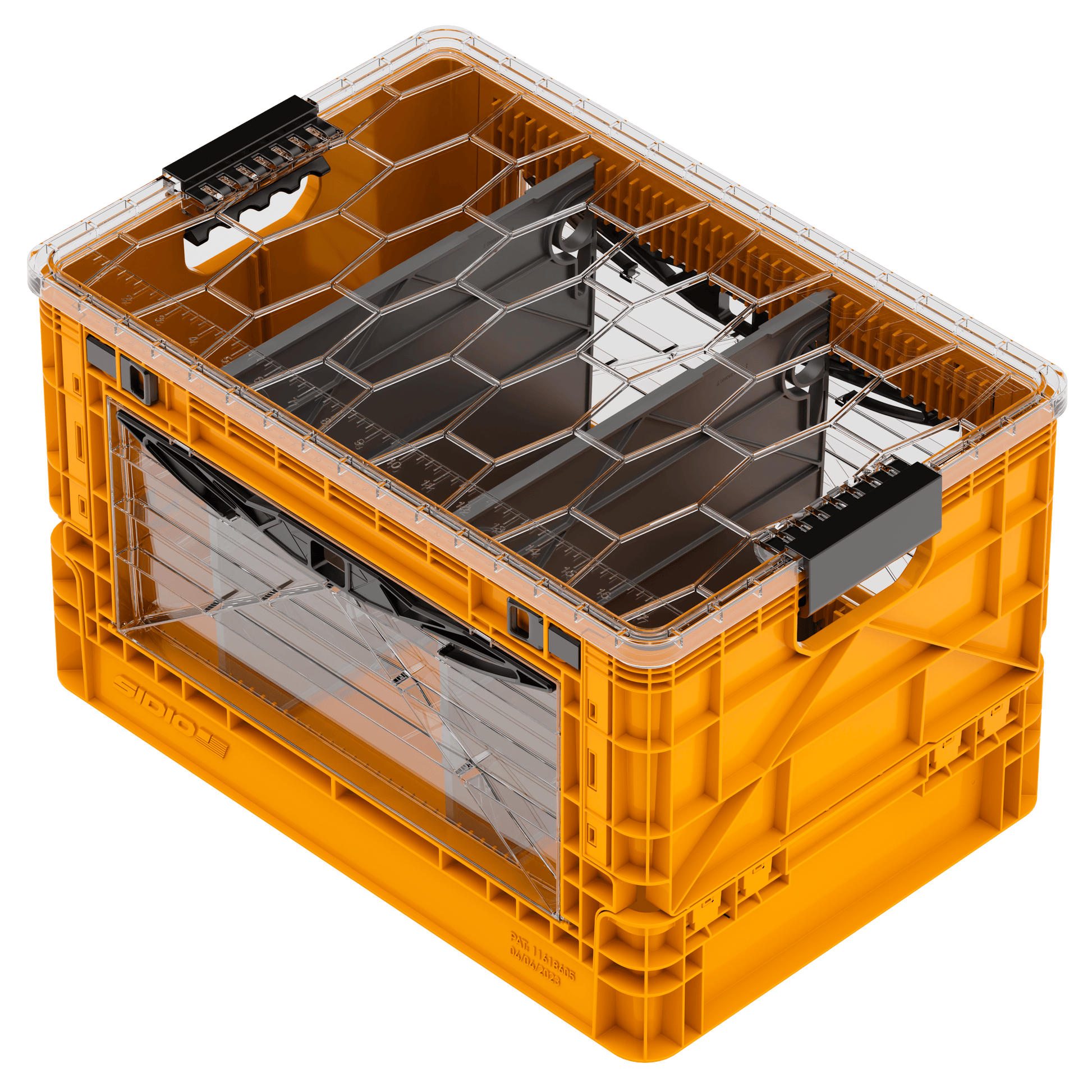 Designed for maximum efficiency and durability, the Full Size Collapsible SidioCrate offers superior storage flexibility. With its collapsible design, reinforced structure capable of supporting over 200lbs, and 41 divider slots, this crate is built for heavy-duty use. The side access window allows for quick retrieval, and it stacks securely with or without the lid, whether collapsed or in use. Made from durable polypropylene block copolymer, it resists cracks, dents, and extreme temperatures, ensuring long-lasting performance. Perfectly stackable with standard 24qt milk crates, it’s the ultimate storage solution for any environment.