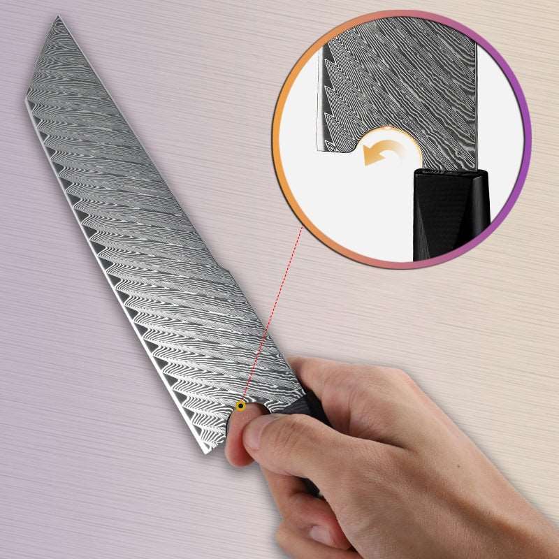 DAMASCUS BLADE DETAIL: The blade is expertly crafted by combining 1095 & VG10 Steel through layering, welding, and hammering, giving each blade a unique design akin to a fingerprint. Damascus steel is renowned for its strength and hardness. We enhance these properties by oil quenching it at 2100°F and cooling it rapidly, repeating the process to ensure it's hardened to the core, achieving a hardness of 58 or higher on the Rockwell scale.