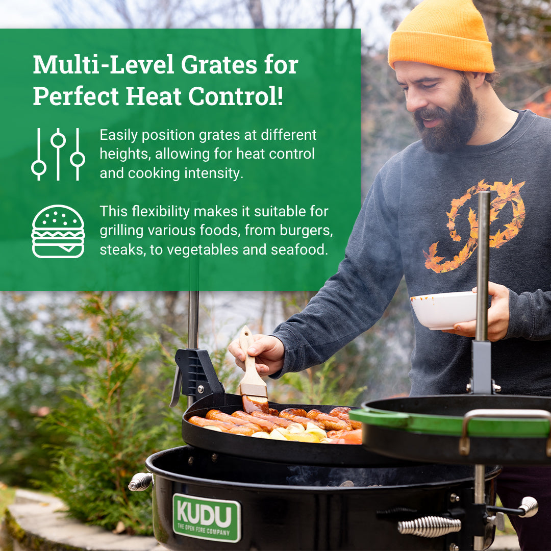 The KUDU Open Fire Grill’s smart, simplistic design allows you to cook over an open flame using your favorite lump charcoal, briquette, seasoned firewood, or smoking wood. Easily adjust both cooking surfaces horizontally and vertically from high heat to low heat by raising the cast iron pan and grill grate away from the flame. The KUDU’s large flat fire pit lets you move the coals around freely, so you can create one large pile of embers or multiple smaller heat zones.