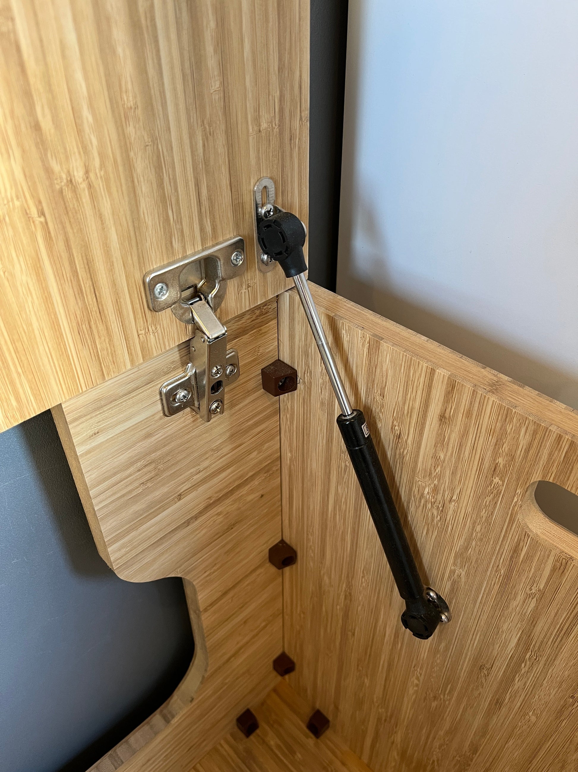 Introducing our innovative and space-saving lift top bamboo van toilet cabinet, designed specifically for the Laveo by Dry Flush Portable Waterless Toilet. The cabinet for the Laveo Toilet includes a cutout on the back for the charge cable so you do not need to remove the toilet to charge. A large opening in the back of the cabinet gives you easy access to the rear removable panel of the toilet.