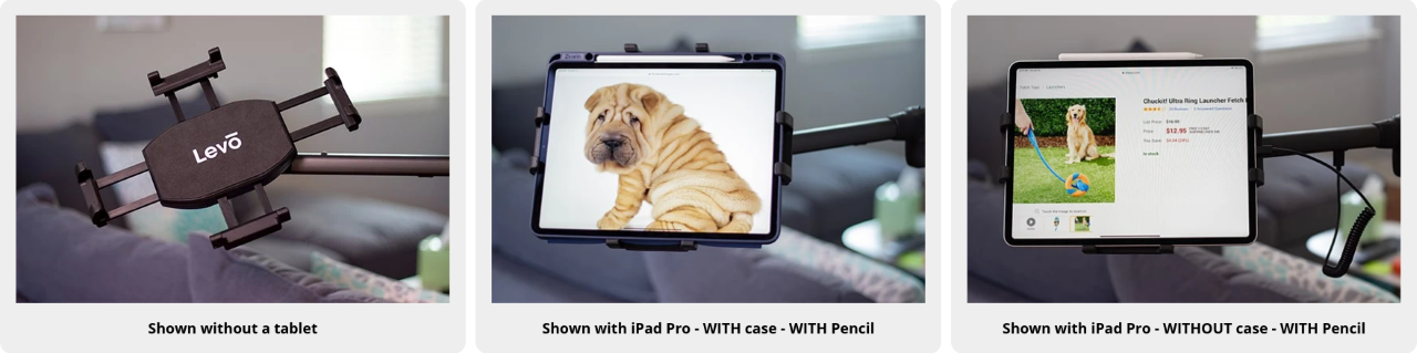 Introducing the LEVO G2 Table Clamp Tablet Stand, a versatile and ergonomic solution designed to enhance your tablet experience across various settings. This stand securely holds tablets and eReaders from 5 1/8 to 13 1/2 inches wide and up to 3/4 inches thick accommodating most tablets with or without cases. Its patent-pending "V" clamp attaches to tables or counters with overhangs as small as 0.25 inches and up to 1.6 inches thick, providing stability without requiring significant edge space. The 5-axis articulating swing arm allows for effortless positioning, ensuring optimal viewing angles whether you're sitting, reclining, or lying in bed. Weighing only 3.5 pounds, this lightweight stand is easily portable, making it ideal for home, office, or travel use. With a sleek gunmetal gray finish, the LEVO G2 Table Clamp Tablet Stand seamlessly integrates into any environment, offering hands-free convenience for reading, streaming, or working.