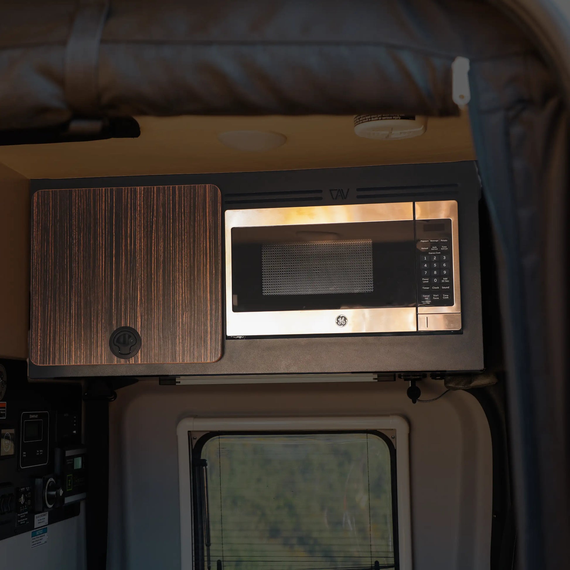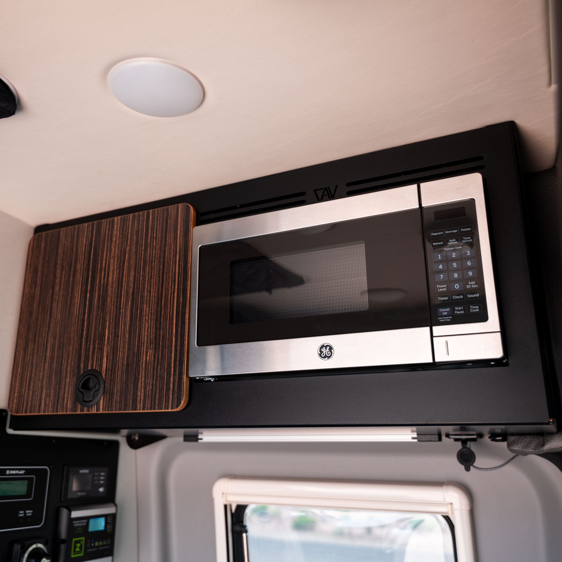 This kit provides an aluminum cabinet extension, microwave, and cabinet door face for Revels 21, 22, 23, or 24. It is easy to install and designed to be used with an existing cabinet. This kit is compatible only with the Compact Microwave, specifically the GE 0.7 cubic foot, 700 watt unit.