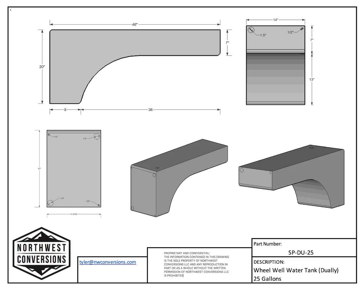 - The SP-DU-25 gallon wheel well water tank is designed to use the wasted space around the well. It is designed to fit the Sprinter 3500, Sprinter T1N and Transit dual wheel vans. The tank can also fit other vehicle makes and models.Check out exterior tanks:Additional Undercarriage 16 gallon water tank or The 11 Gallon Sprinter Undercarriage Water Tank