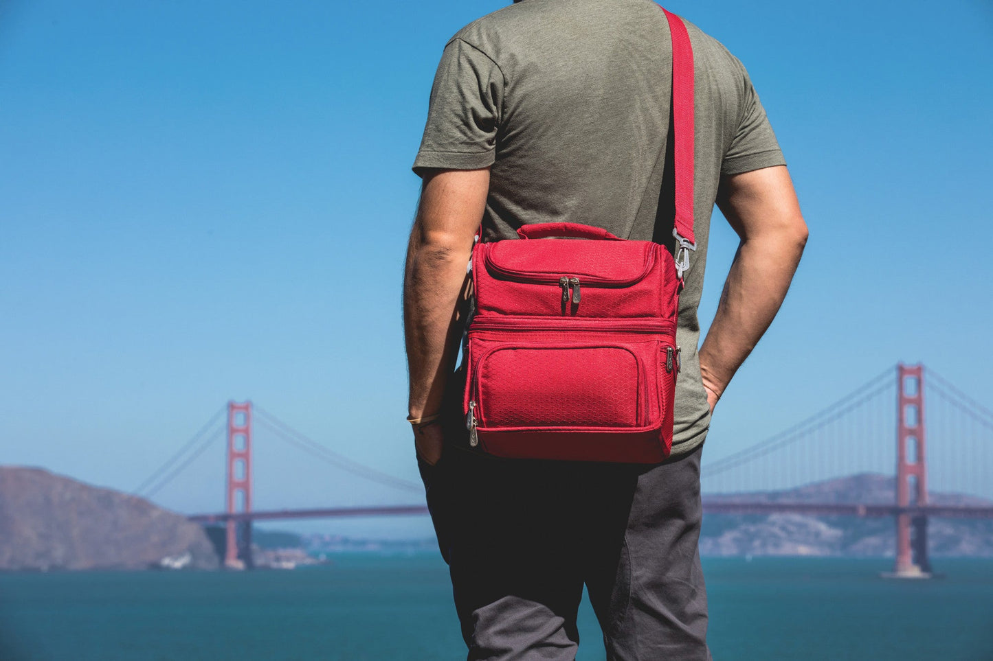 The Pranzo Lunch Bag Cooler with Utensils is a high quality insulated lunch cooler for discerning men and women - after all, no matter your job, you gotta have lunch box! Level up your lunch with this insulated work cooler / lunch bag with top and bottom compartments to separate cold foods from warm/room temperature items. This polyester 8-can-capacity lunch cooler bag with an adjustable shoulder strap and grab-and-go handle also has a secret compartment containing stainless steel silverware, clear plastic salt & pepper shakers, and a 100% cotton napkin. Zippered mesh pockets on each side provide the perfect space for keys, wallets, or other essentials. The Pranzo is the all in one lunch box made for adults!