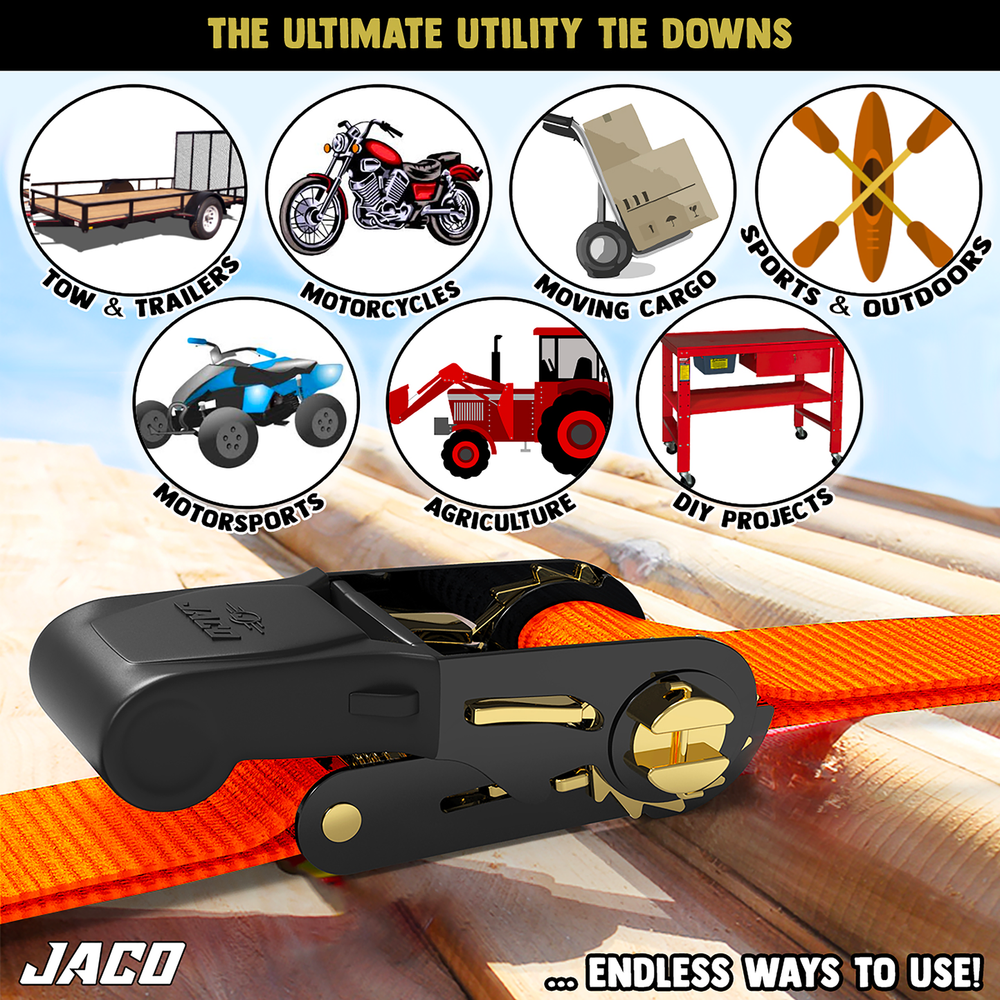 • Built to last for the toughest tie down jobs - from securing your motorcycle, ATV, UTV, kayak, paddle board, dirtbike, moving supplies, or accessories - to cargo on the roof rack, utility trailer, or pickup truck bed - to any job that requires a good ol' reliable tiedown.