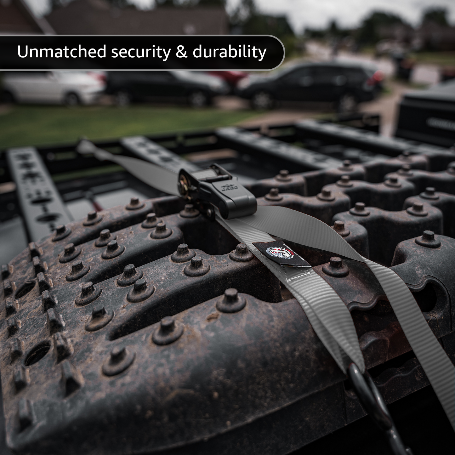 • Rugged, weather-proof tiedowns adjustable up to 15 ft & scientifically engineered with our proprietary PolySilk webbing, providing an ultra soft feel with superior strength & guaranteed strap break strength rated to 1,823 lbs at our AAR certified cargo control lab.