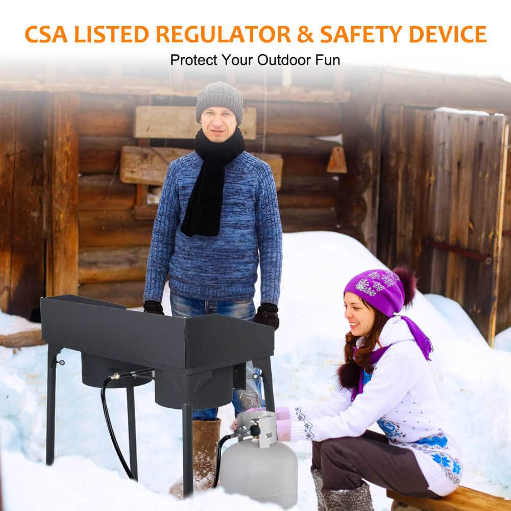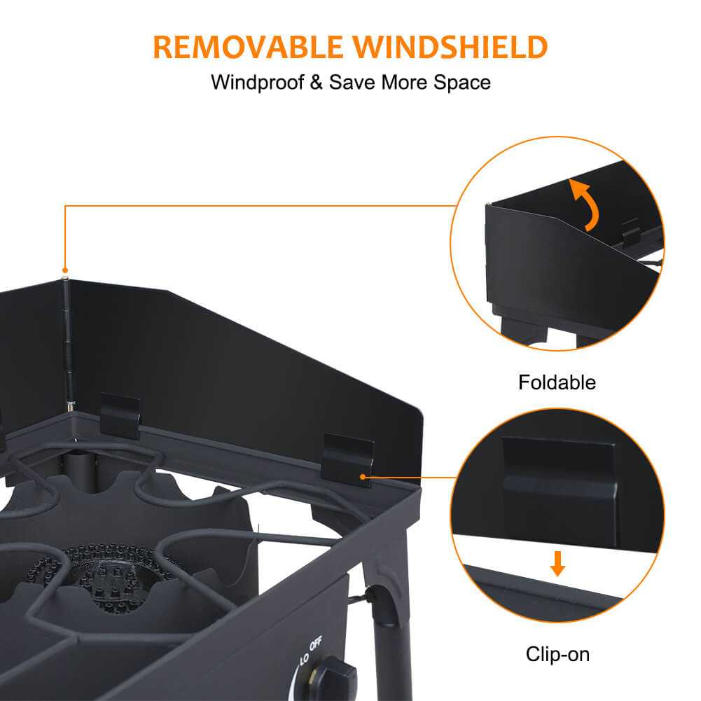 • Multifunctional Outdoor Propane Burner - With detachable legs and 3 foldable and detachable wind deflectors, easy to carry. Very suitable for outdoor use. Such as hunting shutters, deer racks, camping, RV, fishing, hunting camps, tailgates, terraces, sporting events, beaches, beer brewing, canning, and clam baking