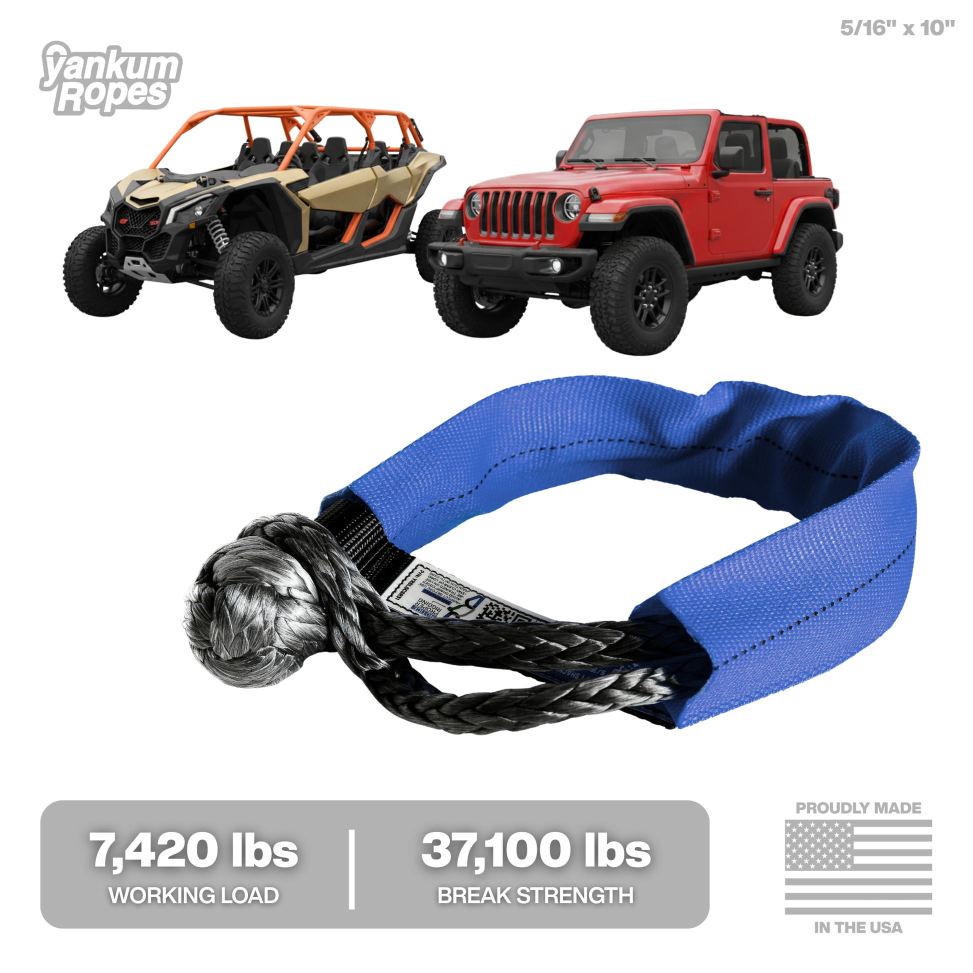 The length is the key difference. The Double Loop Soft Shackles (available in 5/16” and 7/16”) are about twice as long as the soft shackles. This allows you to attach to a hard to reach recovery point, or double it up for about twice the working load limit when winching or connecting ropes together.