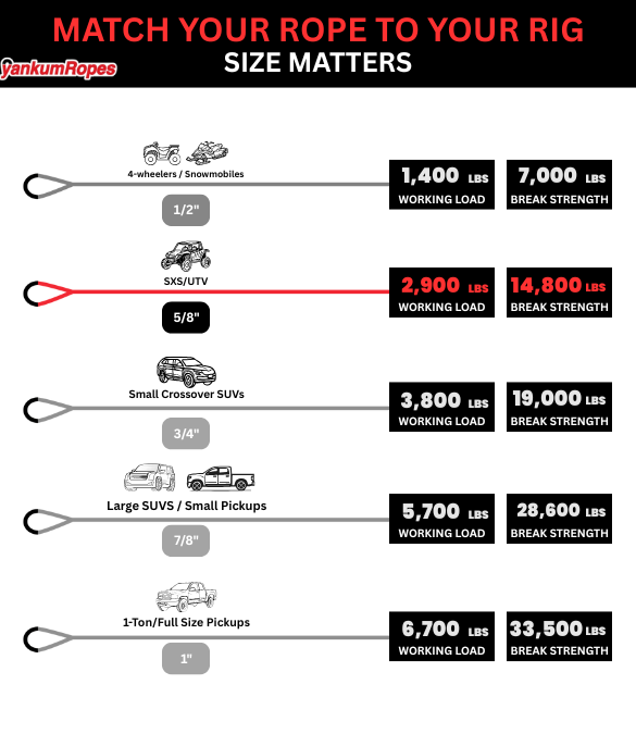 Ropes are rated based on the weight of the vehicle doing the recovery, not the vehicle that's stuck. Taking your SXS to the rescue? You need this 5/8" rope.