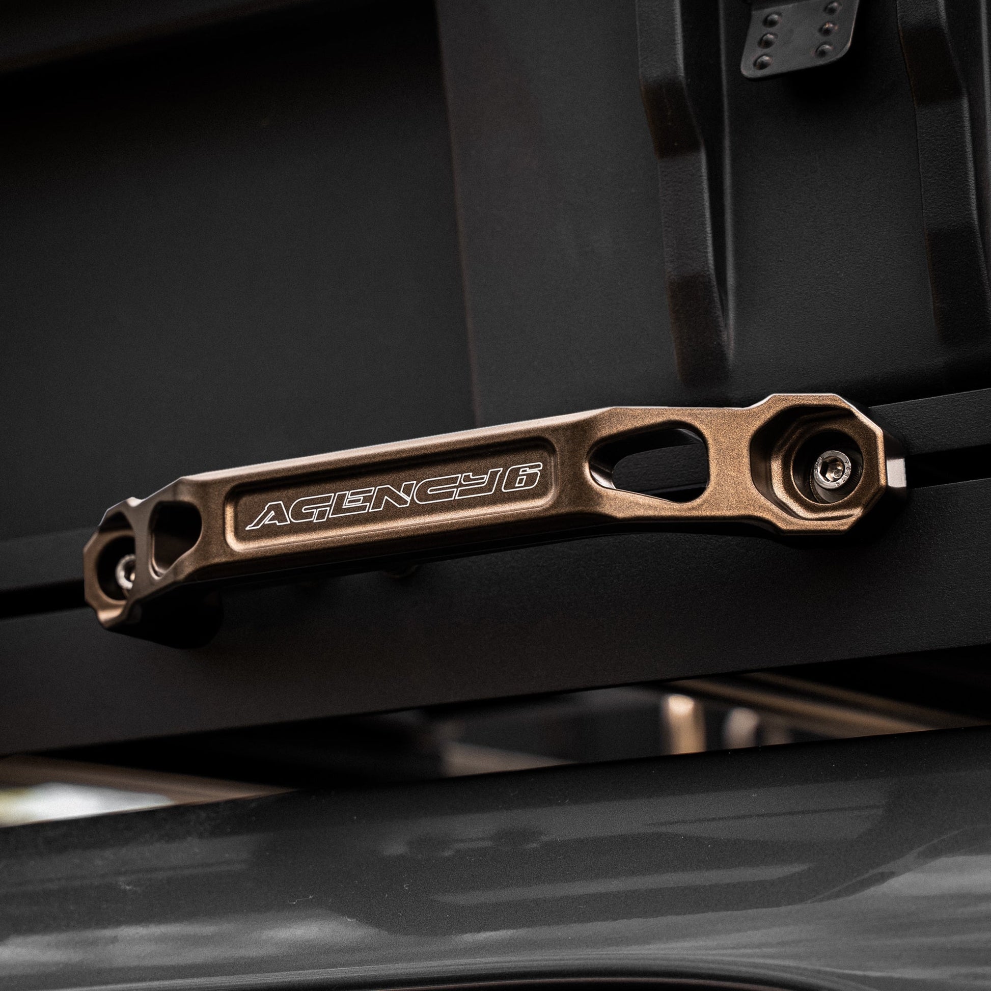 Agency 6 billet grab handles mount easily to a variety of places to make accessing your roof rack or getting in and out less treacherous. Billet aluminum will last a lifetime and the durable powdercoat can bake in the sun or chill in the snow without discoloring.