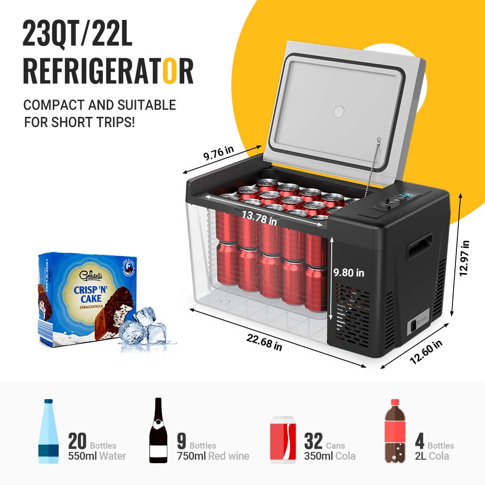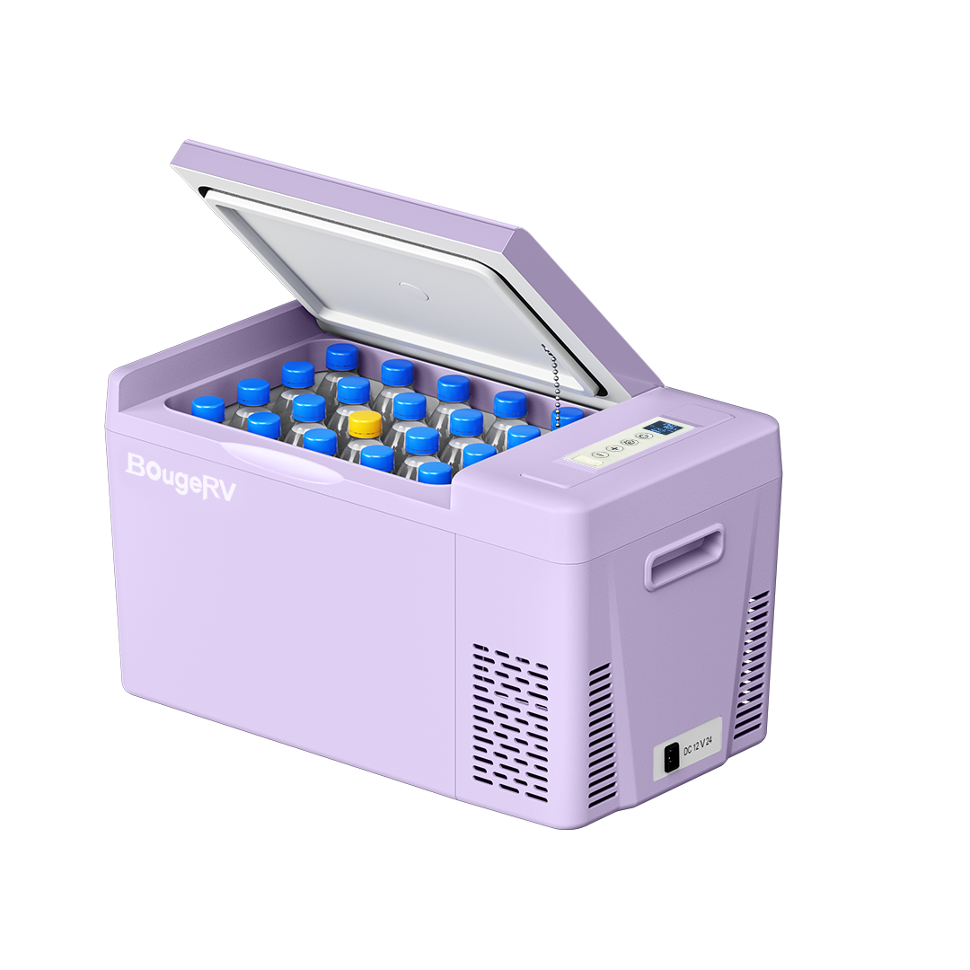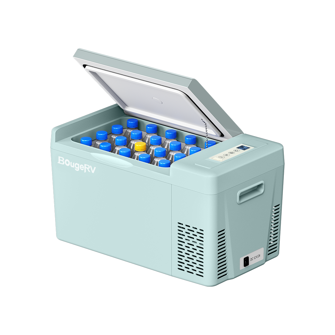 The BougeRV 12V 23-Quart Portable Travel Fridge, with advanced compressor technology and a compact design, is the ideal solution for on-the-go food and drink storage. Perfectly fitting in your car, truck, or RV, and featuring an easy-carry handle, this freezer is your ultimate road trip and outdoor adventure companion.