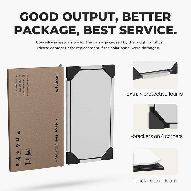 BougeRV bifacial solar panels offer an astounding 30% increase in output compared to standard models, thanks to their unique transparent backside. This enables the panel to absorb solar energy from both sides, utilizing direct sunlight, refracted sunlight, and diffuse sunlight.