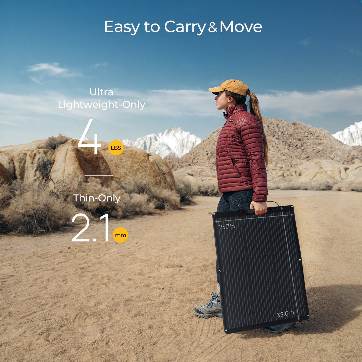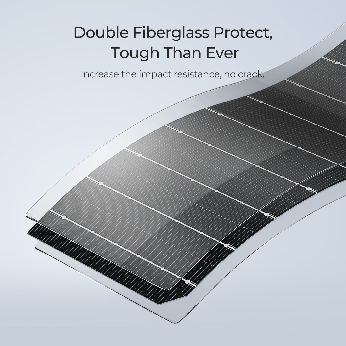 BougeRV curved solar panel offers unmatched flexibility and durability. With double glass fiber layers placed on the upper and lower surfaces of the 10BB mono solar cell, this panel is protected from damage to the maximum extent. No worries about cracks. By conforming better to curved surfaces, it maximizes the use of limited roof space or even the curved sections of a vehicle's front. This fiberglass solar panel is ultra-lightweight, weighing only 4 lbs and measuring only 2mm thin, which makes it easy to carry and move.