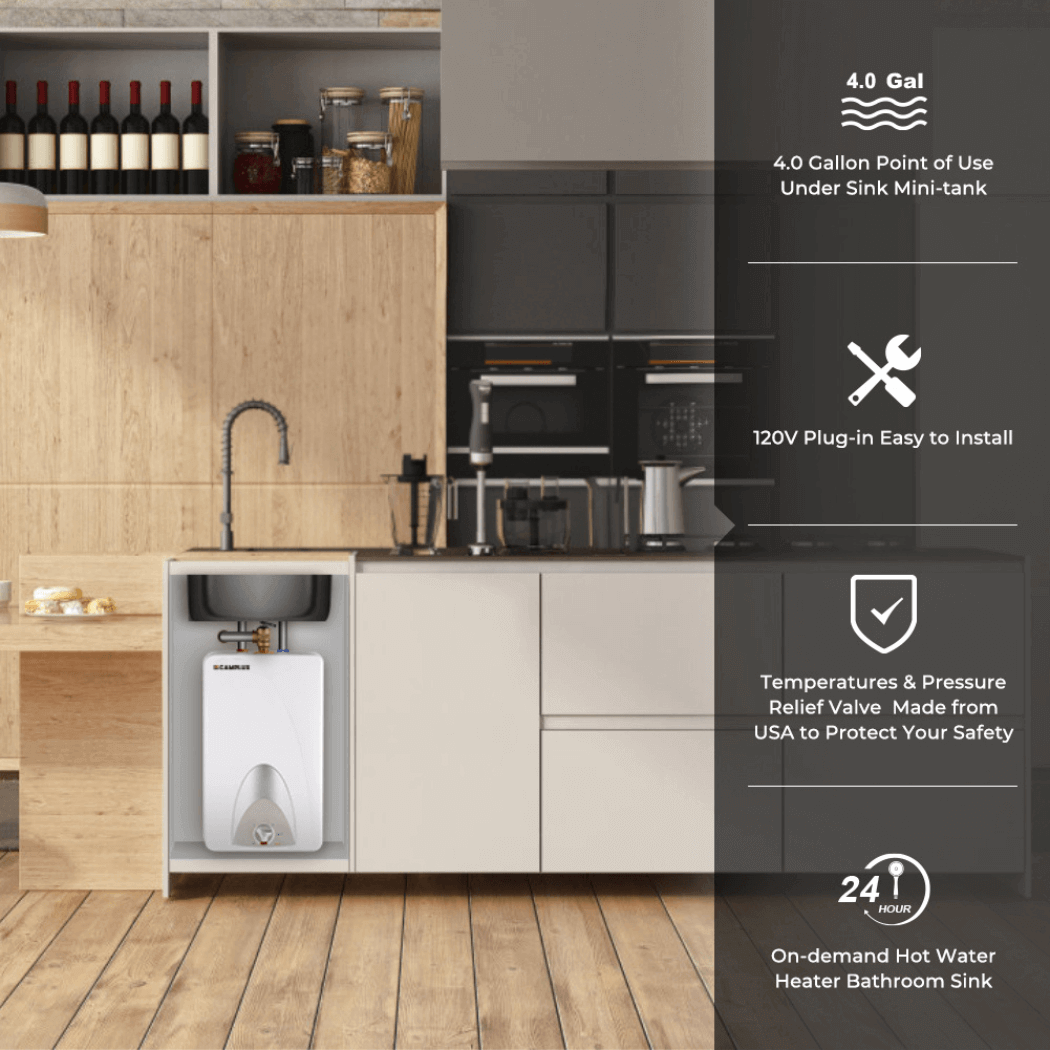 - Saving Energy & Money- Built in insulation foam, reduces heat loss. 4-gallon point-of-use mini-tank fits under your sink to provide hot water right where you need it.