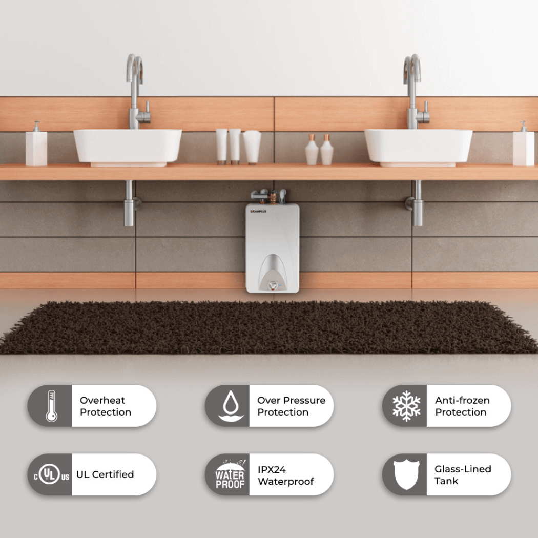 - High Quality Built & Elegant Design- Camplux electric water heater has glass-lined tank for long service life and easy to maintain. Elegant streamline design cover, made your kitchen more pretty.