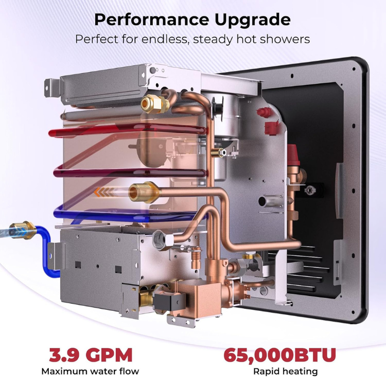 • 【High Heating Power】65000 BTU heating power & 2.64GPM capacity, Camplux RV tankless water heater propane will deliver hot water on demand, no need to waste 20-30 minutes waiting for hot water in the middle of the shower.