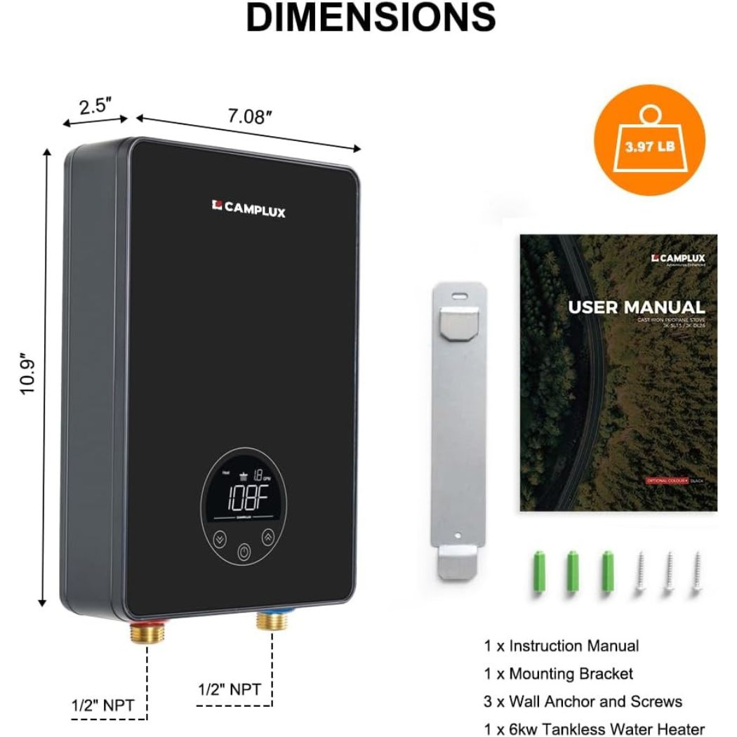 Enjoy hot water anytime with the Camplux Electric Water Heater 6kw, featuring an instant on-demand heater with a digital display and hard-wired installation. Get consistent hot water, saving up to 50% in energy consumption with a temperature rise of 1.0 GPM up to 50°F. Smartly adjust the real-time temperature with an LED touch display and feel secure with its 304 food-grade stainless steel water tube design, safety features and anti-leakage protection. Get hot water in just 2 seconds!