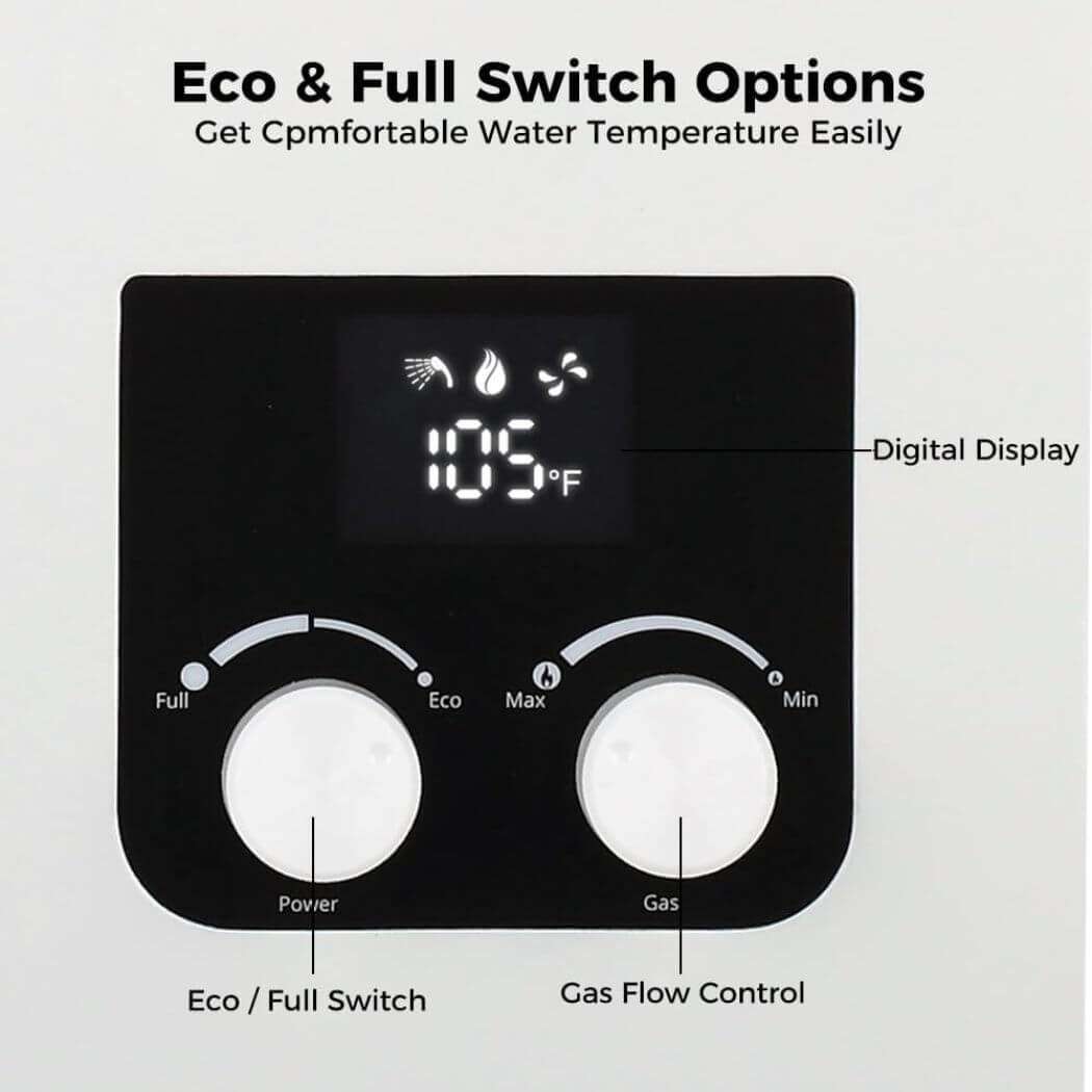 - Compact Design, Energy saving -The compact size instant hot water heater saves more space than traditional tanks.Trendy and modern design with Fahrenheit digital temperature display. Eco and Full gas switch for energy saving and get ideal hot water temperature.
