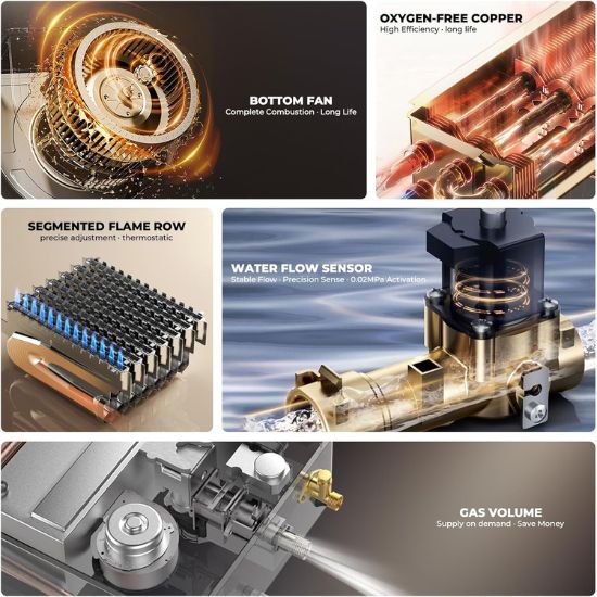 • Direct-Current Frequency Conversion Fan-The propane gas water heater comes with a direct-current frequency conversion fan. The water heater can resist level 8 strong wind and you no need to worry about the water pressure in high floors.