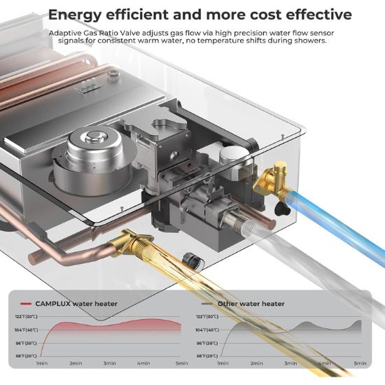 • 3 Simultaneous Applications In Winter.Camplux advanced 6.86 GPM high capacity flow control propane gas tankless water heater delivers 6.86 gallons per minute of on-demand endless hot water ensures instant hot water for 3-4 persons whole home shower and kitchen at one time.