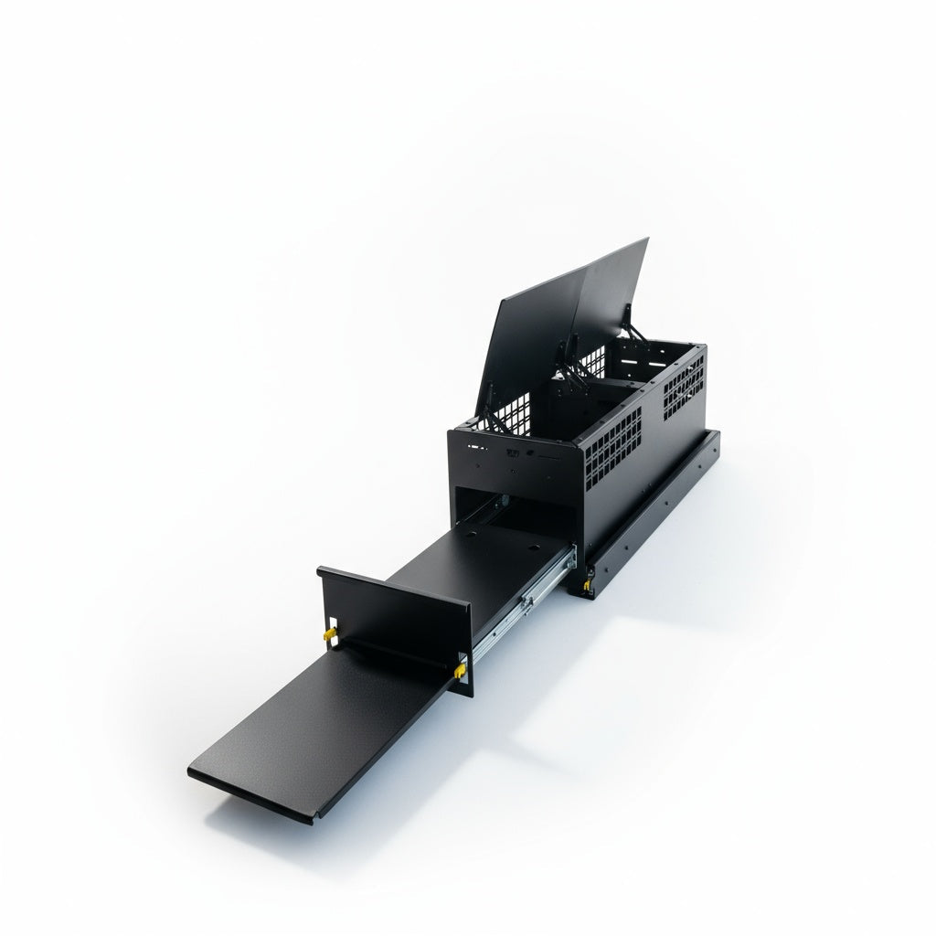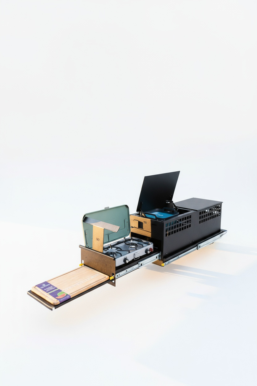 The Canyon Kitchen is a custom modular storage solution that bolts to a 48" slide and features multiple storage compartments with flip-up tops for easy access.