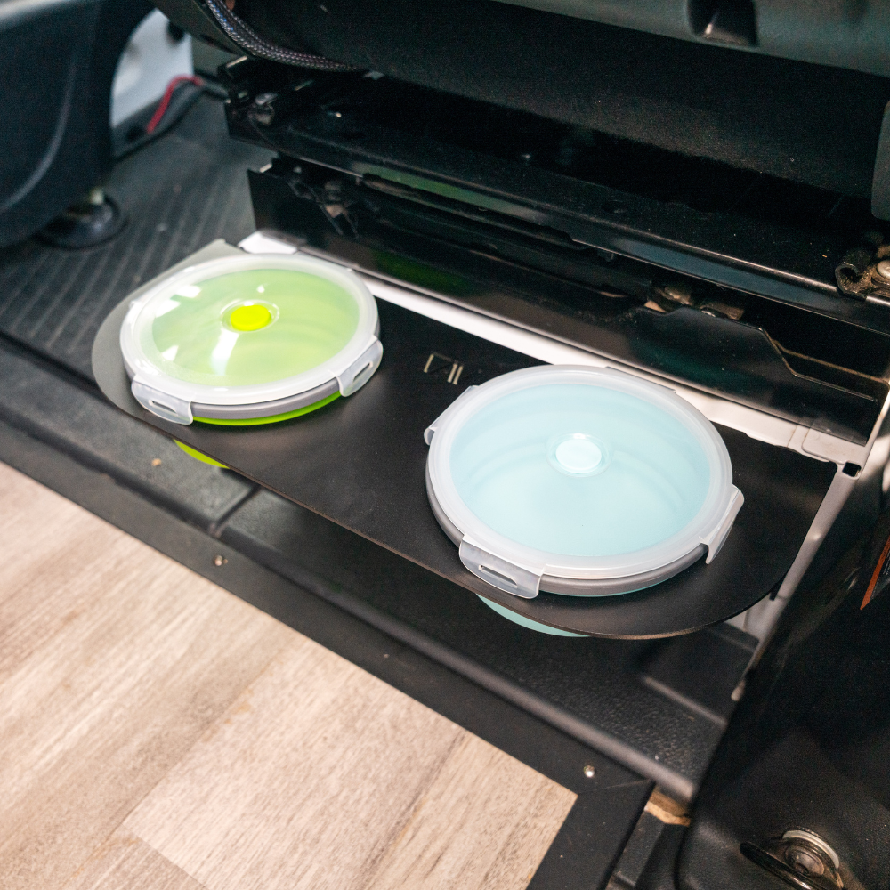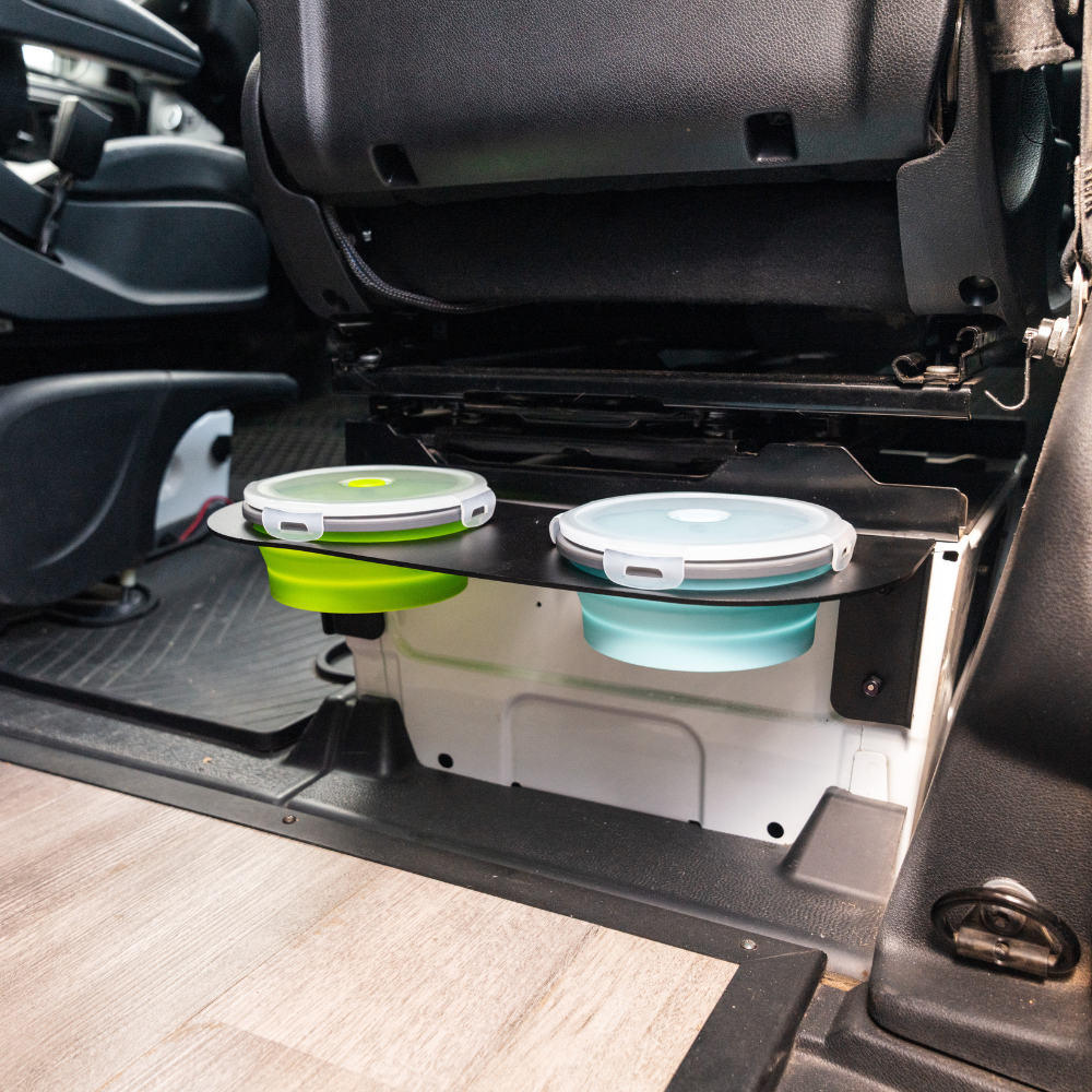 Keep your pet's dining space tidy and stable on the road with the Canyon Pet Bowl. This magnetic pet bowl holder slides onto the bottom of the passenger seat by the sliding door, securely holding two collapsible bowls with lids to prevent spills while driving.