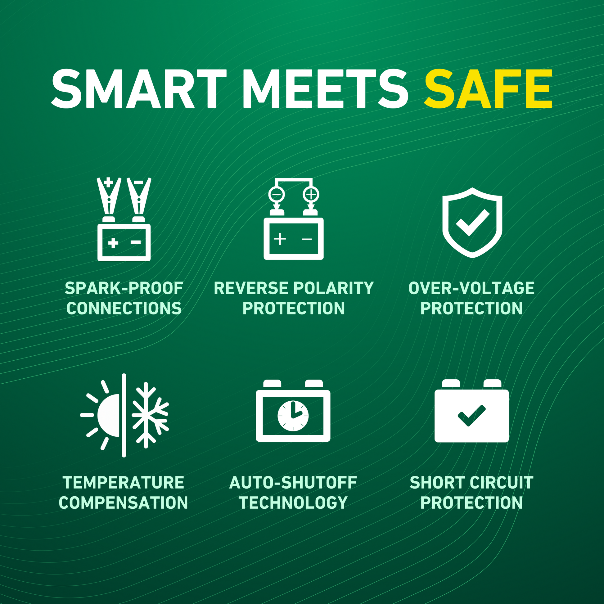 Our proprietary Charge N Store™ technology monitors and maintains optimal float voltage during long-term storage, ensuring your battery stays ready for action. Multiple built-in safety features, including spark-proof connections, reverse polarity protection, and temperature compensation, provide peace of mind during every use.