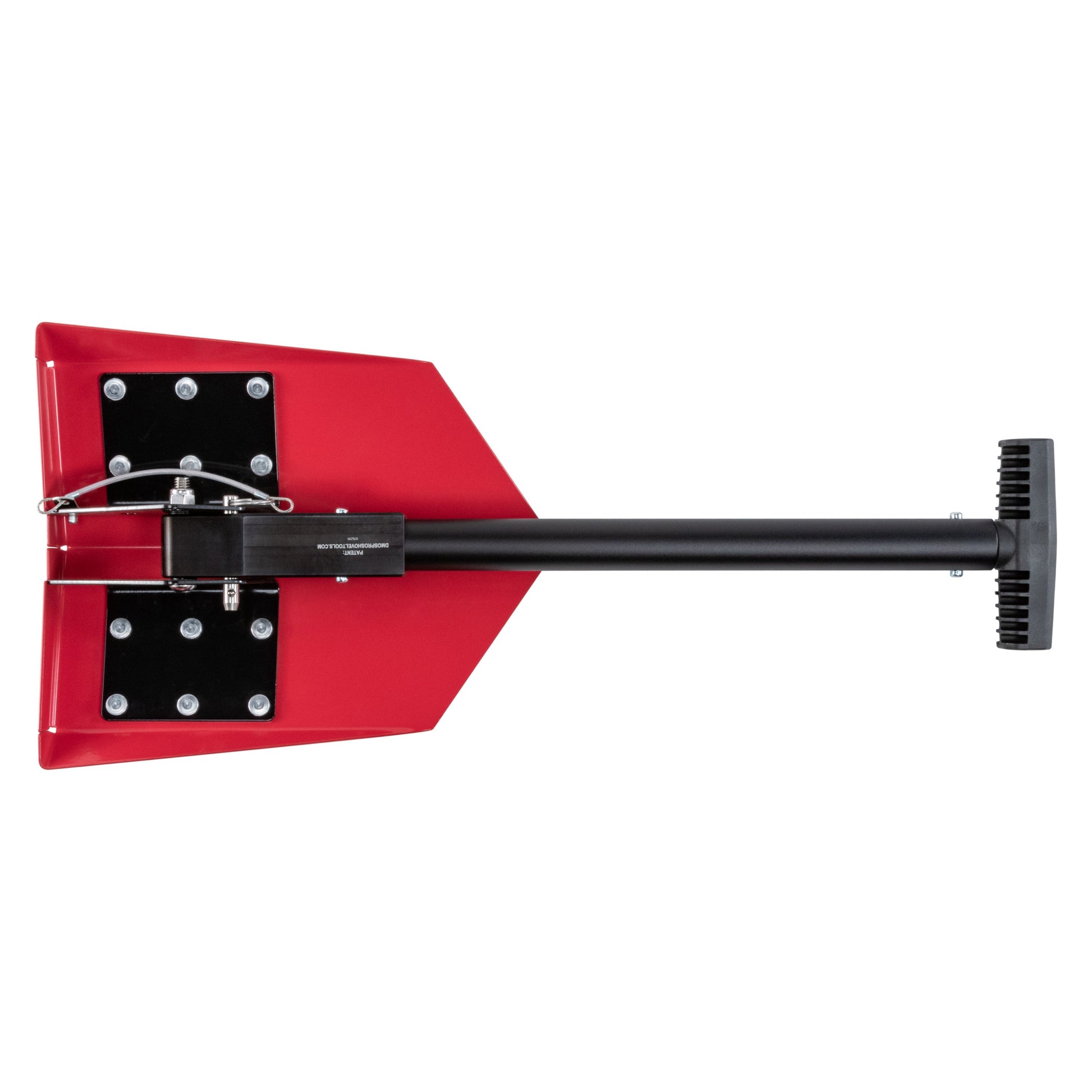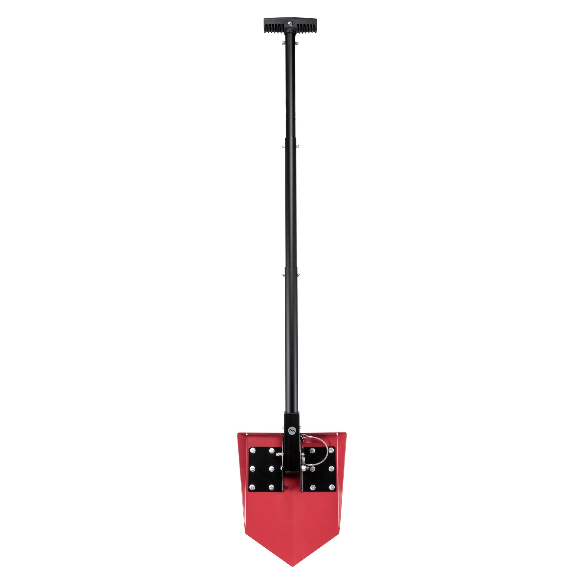 - 3-position folding shovel head with hoe, dig, and storage positions