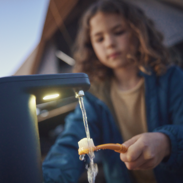 Dometic’s Hydration Jug can hold just about 11 L and contains two openings: one 4-inch opening for quick filling and dispensing, and a smaller 63mm opening, which is the industry standard so you can easily connect many of the common water filtration devices.