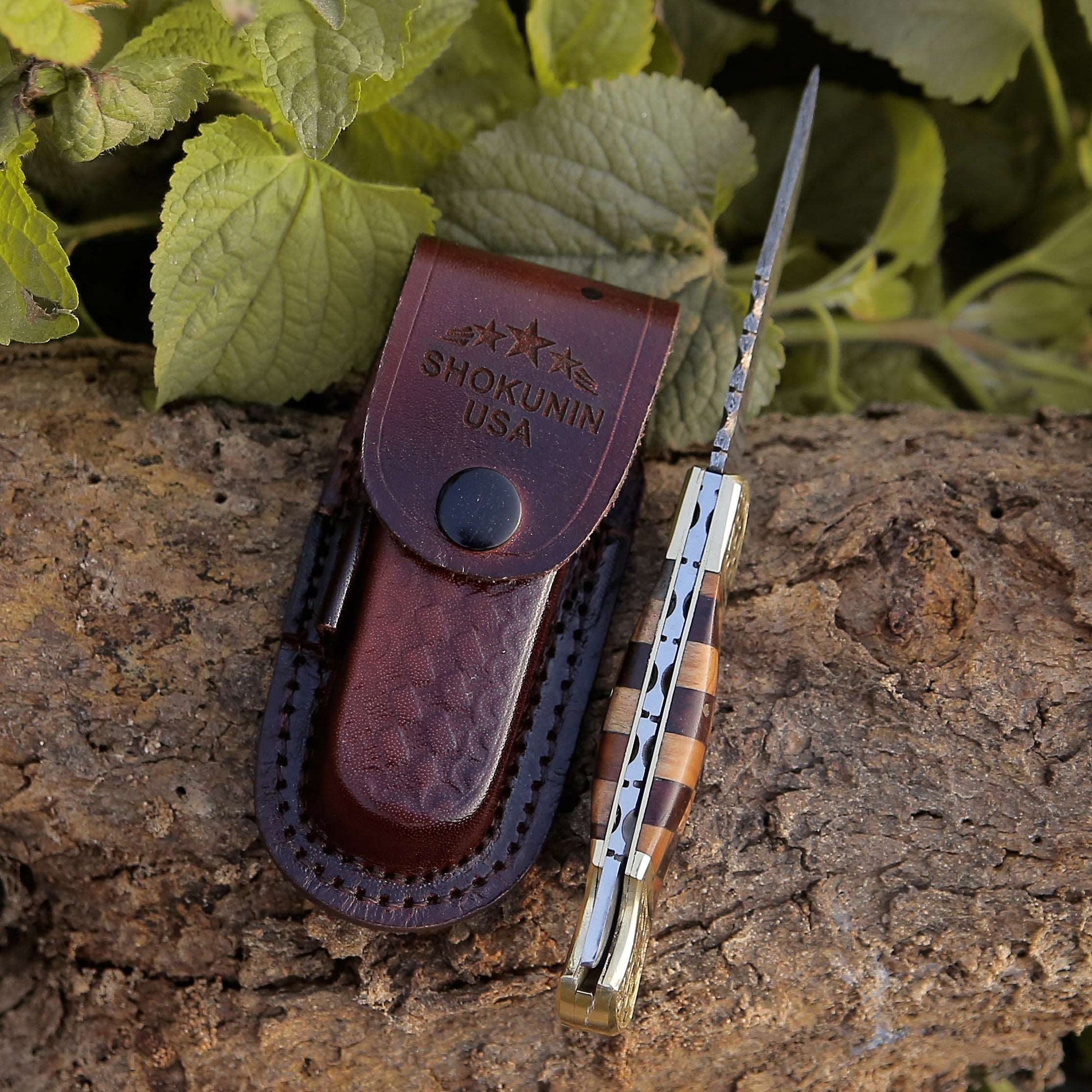 Expedition Handmade Custom Gentlemans Damascus Pocket Knife - 7.5" Overall with Carved Brass & Pakkawood Scales, Back lock Pocket knife with Hand Stitched Leather Sheath, Pro Knife Sharpening, Spare Pocket knife Sharpener & Personalized