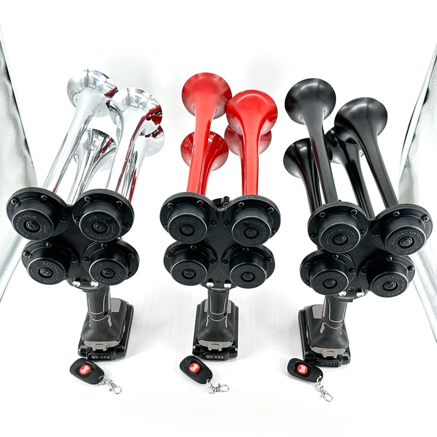 The Extreme model of long trumpets is applicable to all brands of Horn Guns. When you purchase this upgrade option, you get +40% more sound power and super-low tone. This is not an extra trumpet set, this is an upgrade option. 3 colors are available. This is not a whole DIY Kit. No compressor included, no wiring included, no receiver included, no remote included.